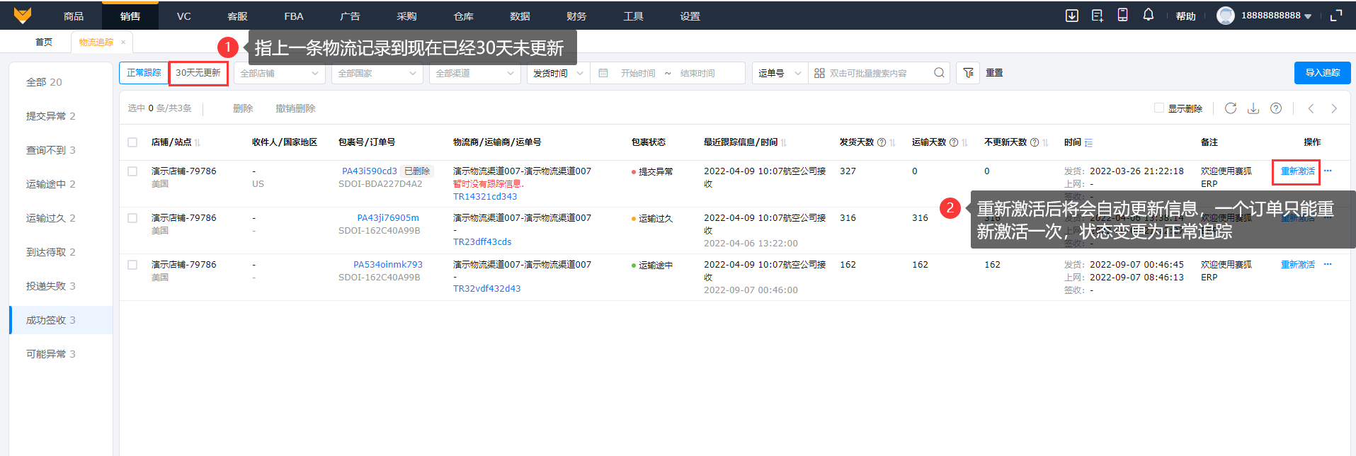 3.4 30天无更新的订单可以点击“重新激活”,重新激活后将会自动更新信息,一个订单只能重新激活一次,状态变为正常跟踪。