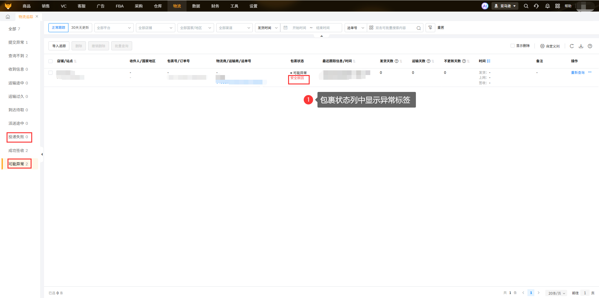 3.6 投递失败和可能异常状态列中会展示异常标签,如安全问题、拒收、延误、丢失、地址错误、退件中等;