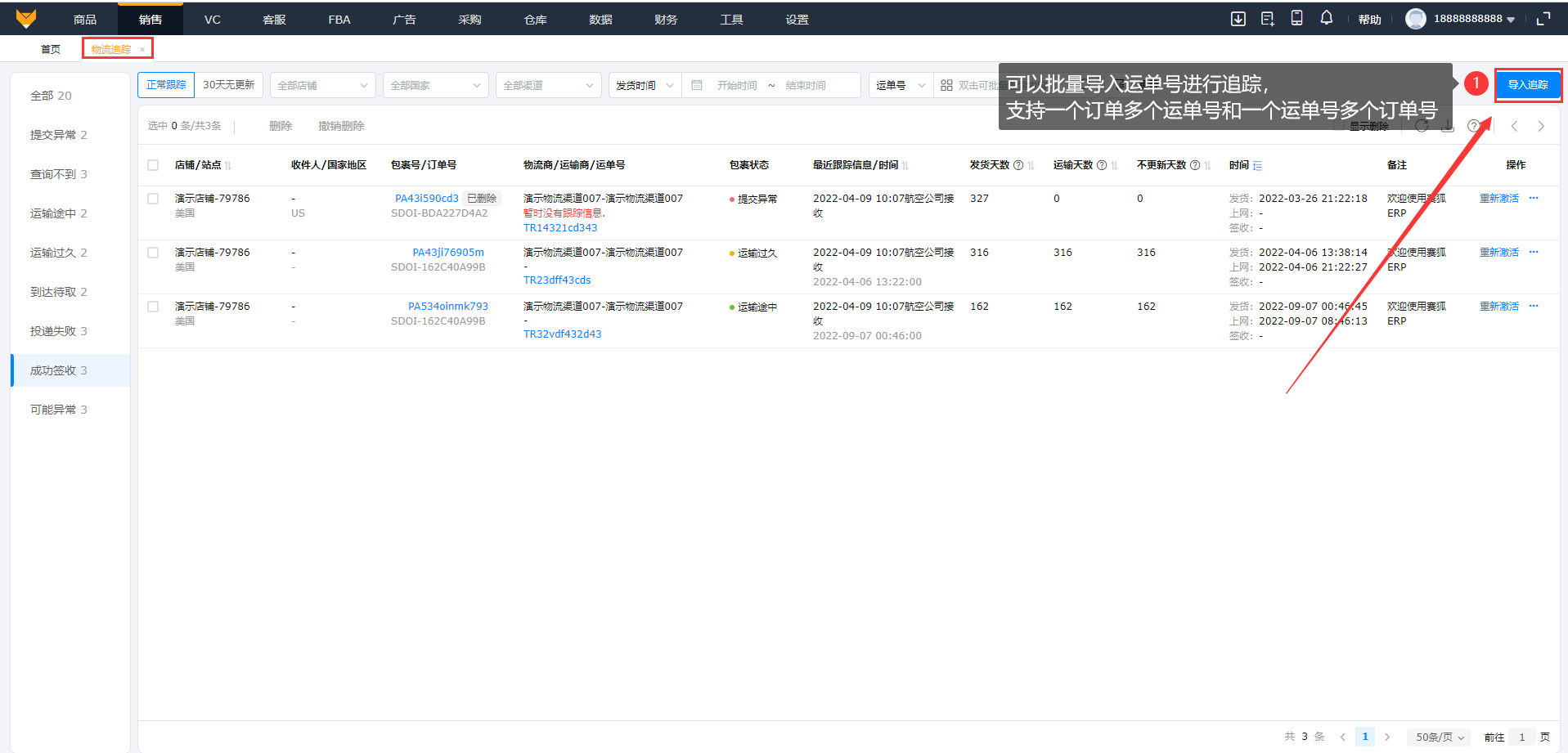 3.5 可以批量导入运单号进行物流追踪,支持一个订单多个运单号和一个运单号多个订单号;