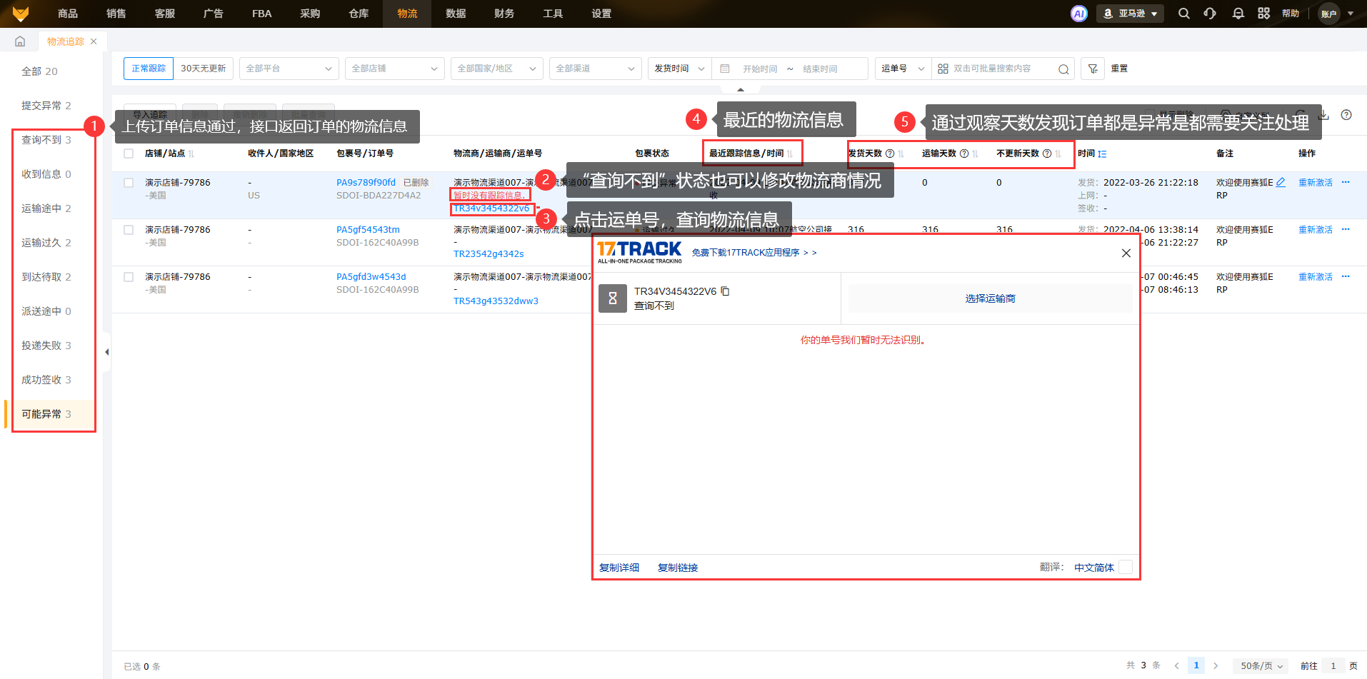 1.2 左侧列表栏中,其余状态表示信息提交给17track后,接口反馈的物流信息。
