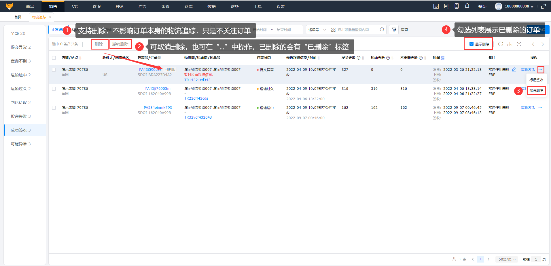 3.1 支持删除订单的物流信息,且可以取消删除。删除不影响物流信息的更新,只是不关注该订单的物流。
