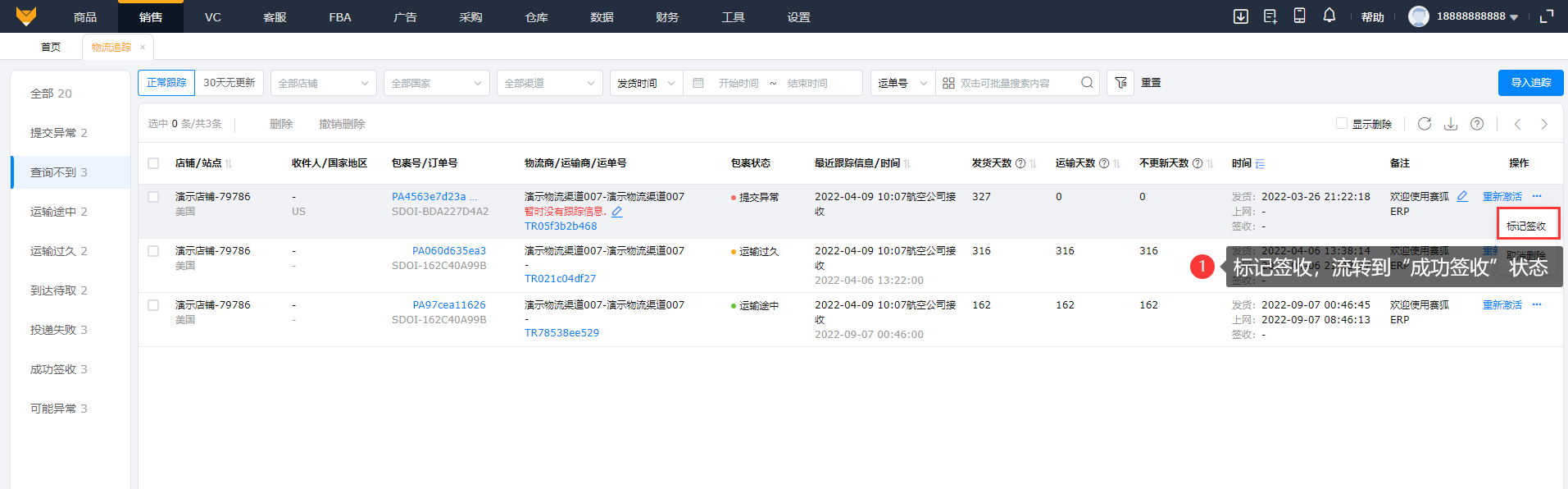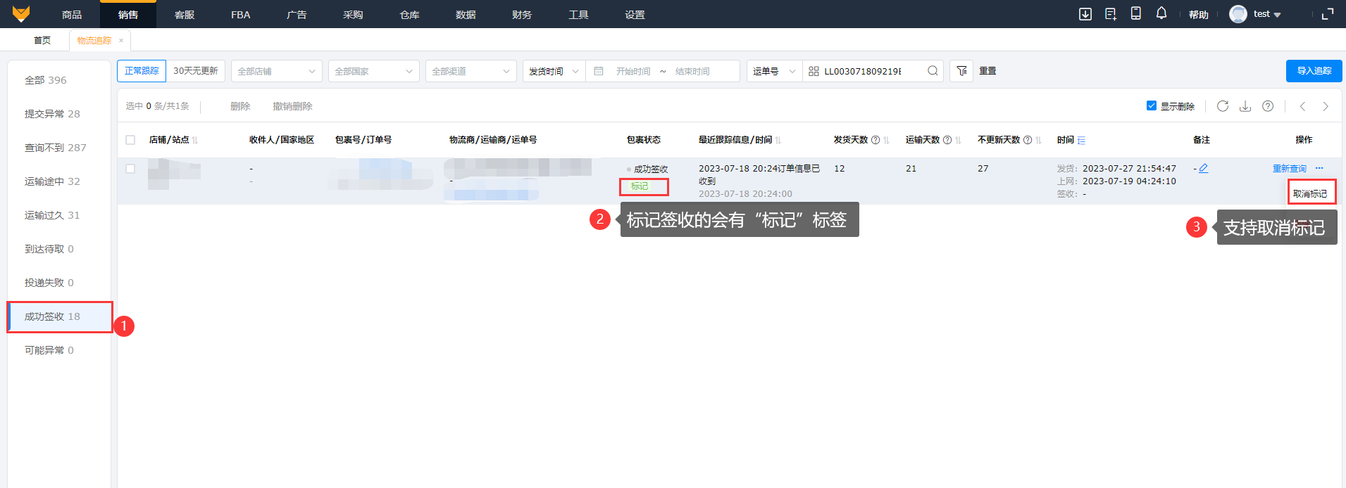 3.3 支持手动标记已签收和取消标记,已标记签收的订单流转到“成功签收”状态。