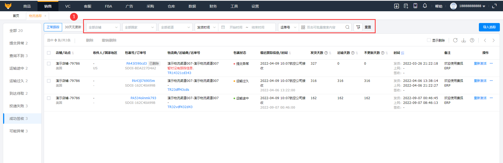 4.1 根据店铺、国家、渠道、时间、运单号/包裹号/订单号/备注进行搜索。