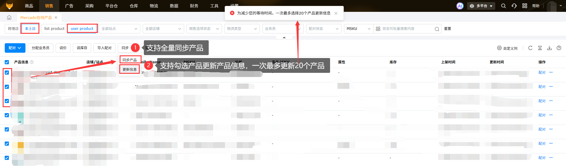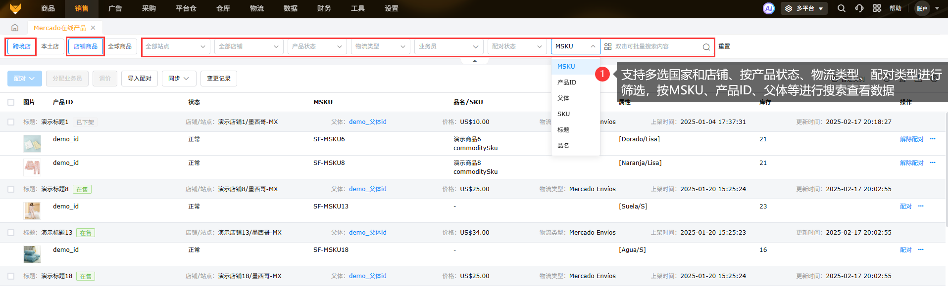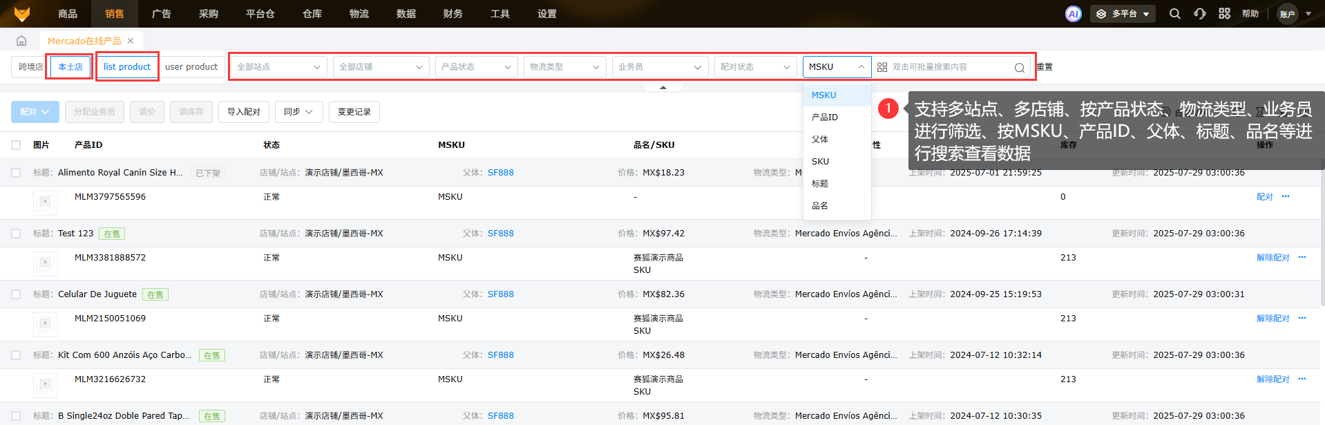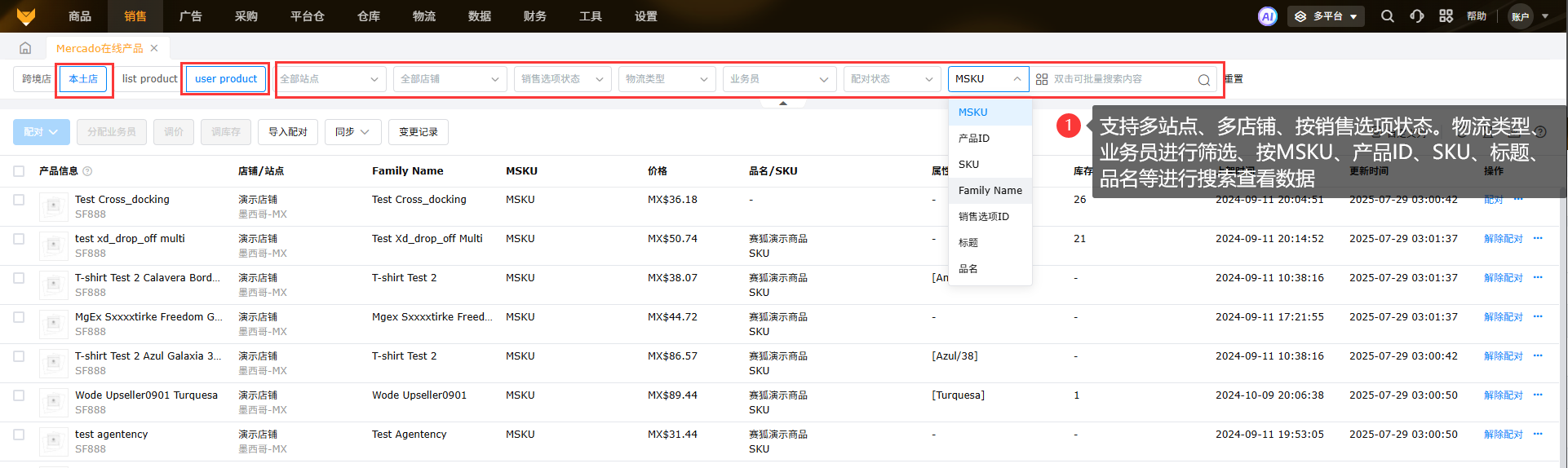 user product(本土店):支持多站点、多店铺、按销售选项状态、物流类型、业务员进行筛选、按MSKU、产品ID、SKU、标题、品名等进行搜索查看数据