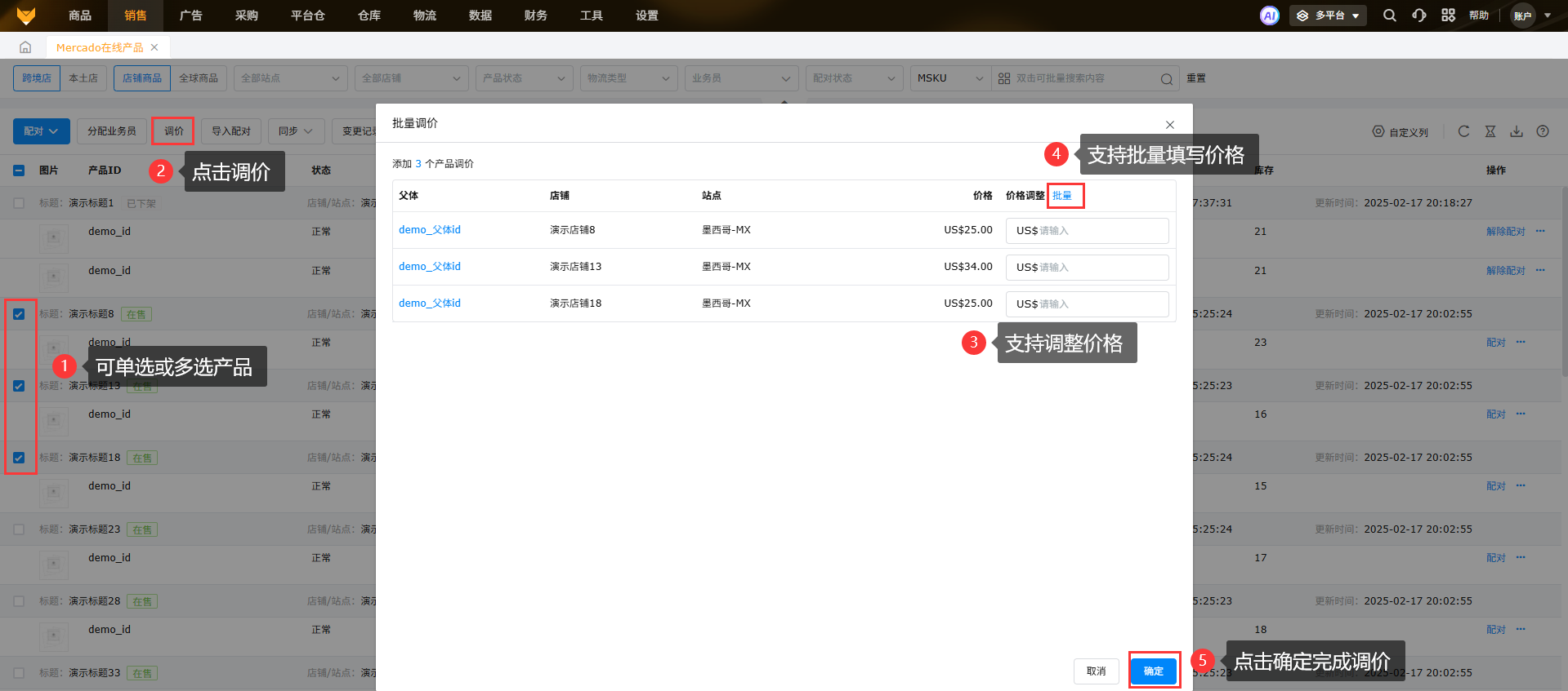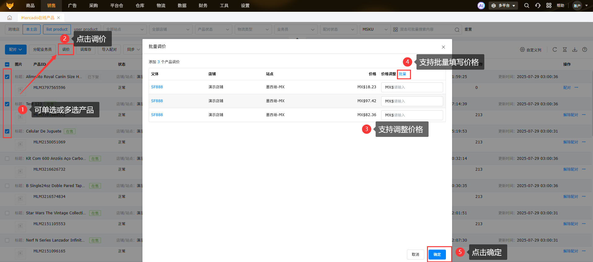 勾选产品,点击【调价】,修改对应产品价格以及促销价。