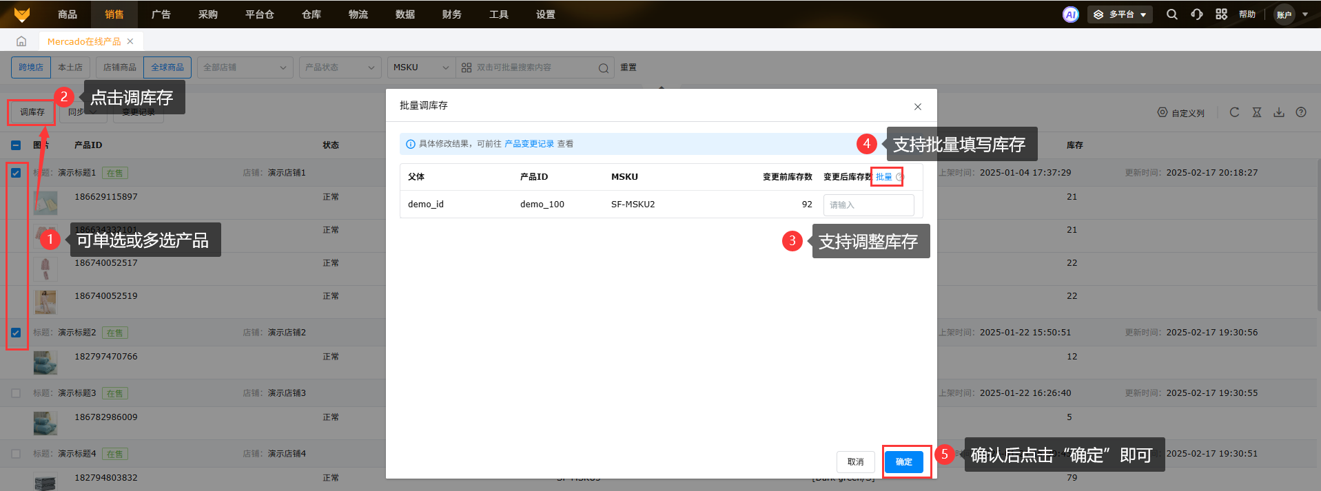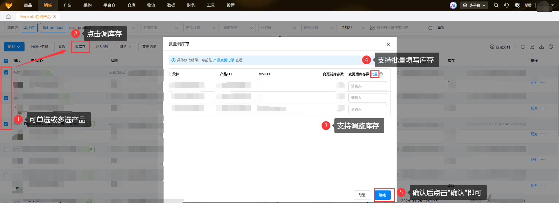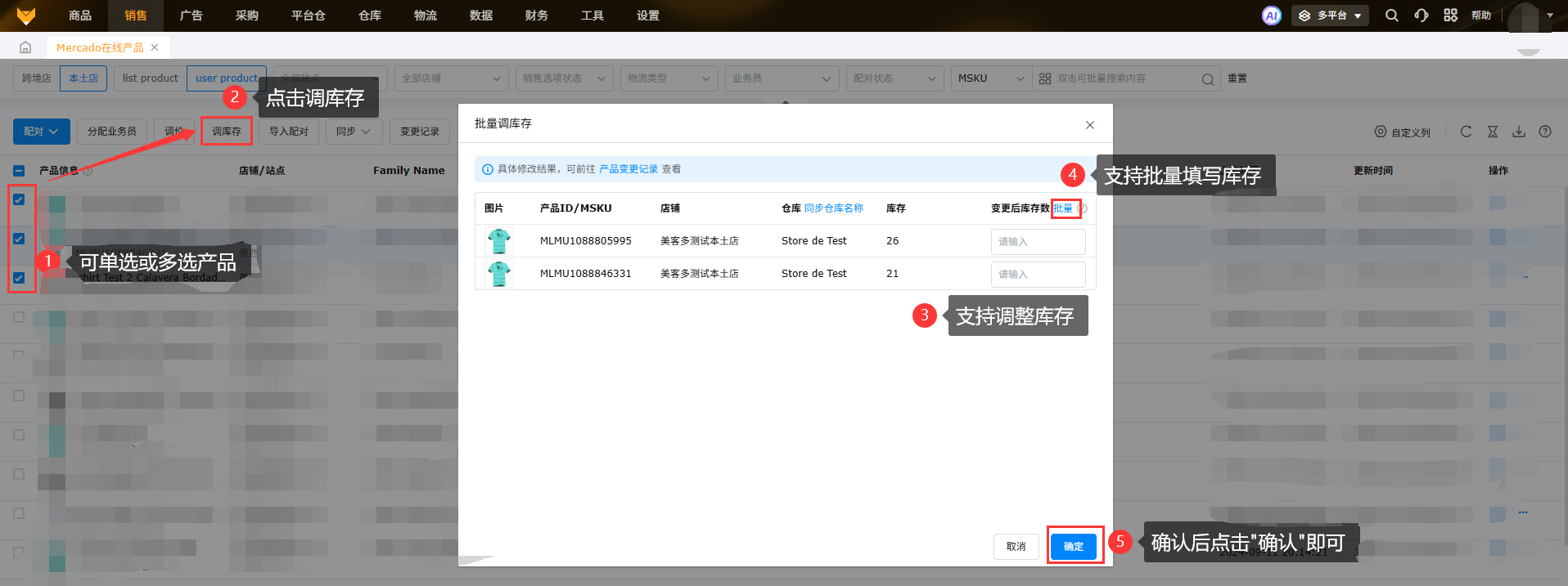 勾选产品,点击【调库存】,修改产品的库存数量。