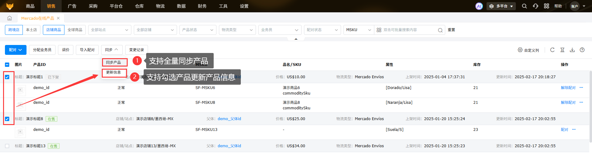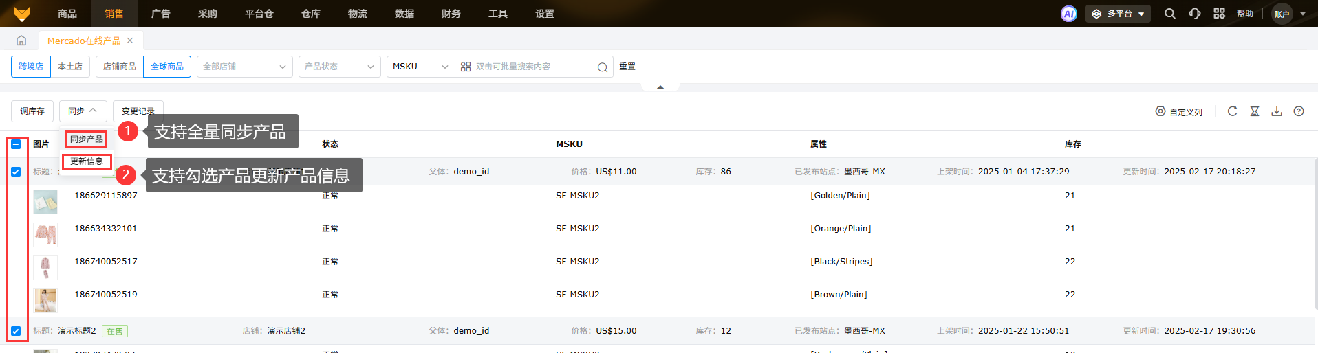 在系统完成授权店铺之后,在线产品页面会显示已授权店铺的产品MSKU、价格、库存、属性等信息。