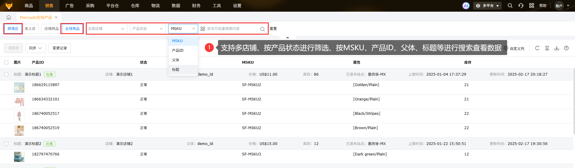 list product(本土店):支持多站点、多店铺、按产品状态、物流类型、业务员进行筛选、按MSKU、产品ID、父体、标题、品名等进行搜索查看数据