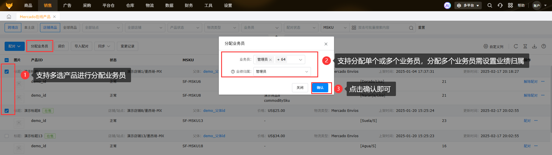 勾选产品,点击【分配业务员】;支持多选业务员,如果选择多个业务员,需选择业绩归属,如不选择则默认归属于第一个人;