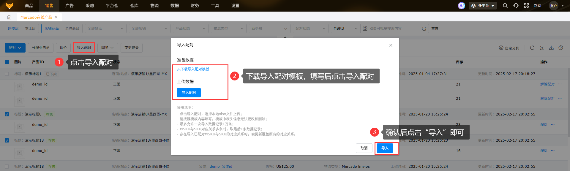 操作:点击【导入配对】下载导入配对模板,填写模板信息,上传模板文件,点击【导入】即可。