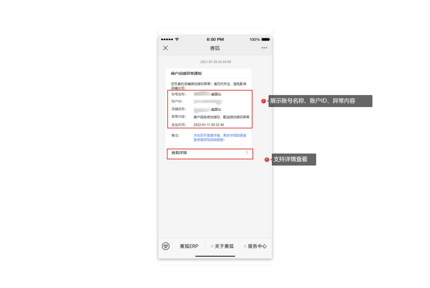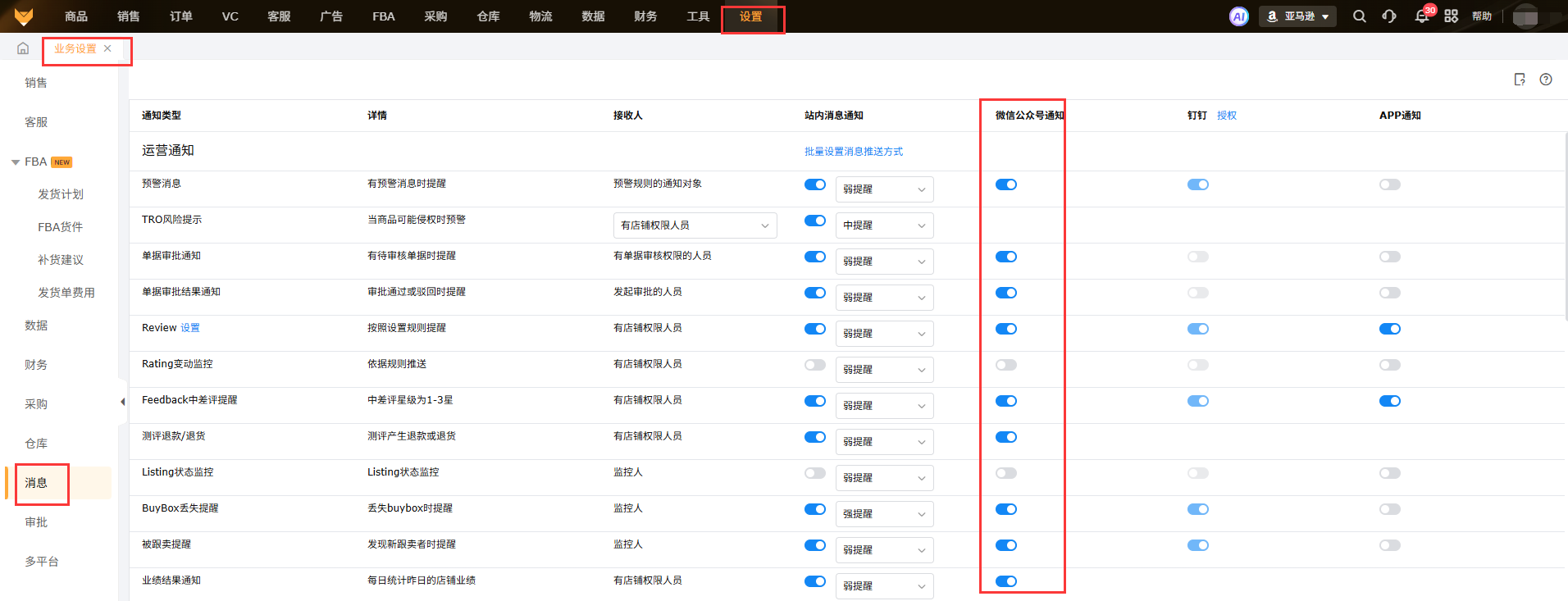 公众号接收提醒需本人的赛狐账号在【设置】-【业务设置】-【消息】页面开启消息提醒。