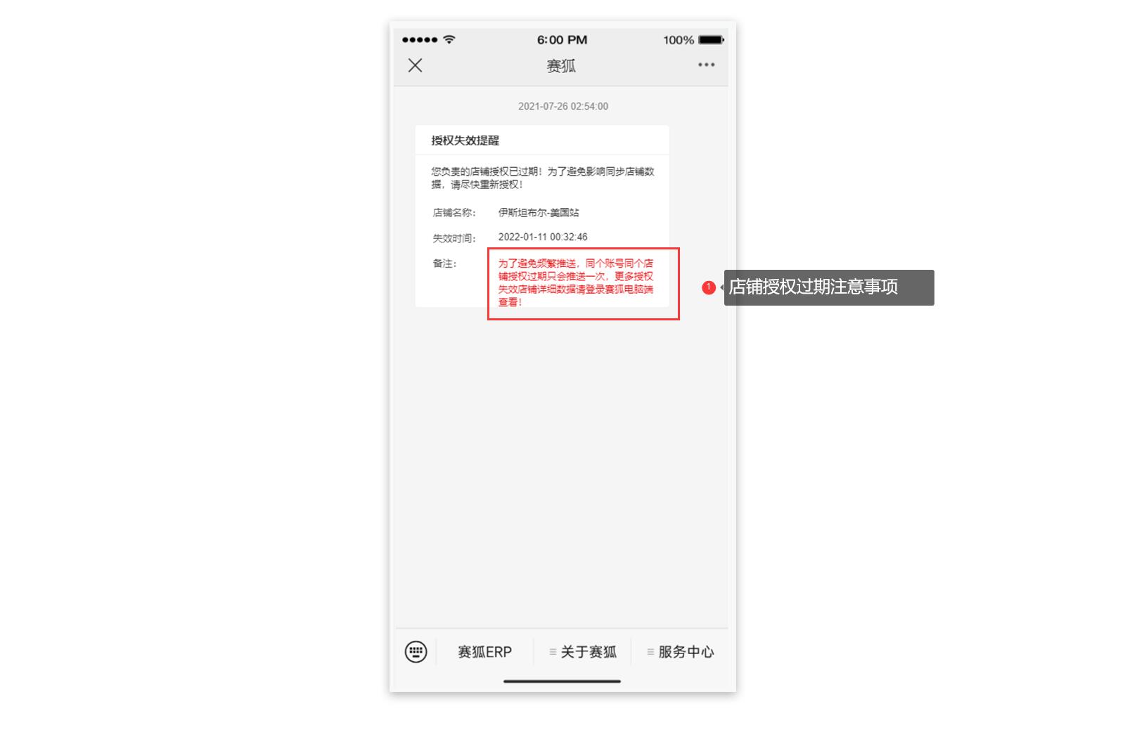 注:同个账号同个店铺授权过期,只会推送一次消息提醒