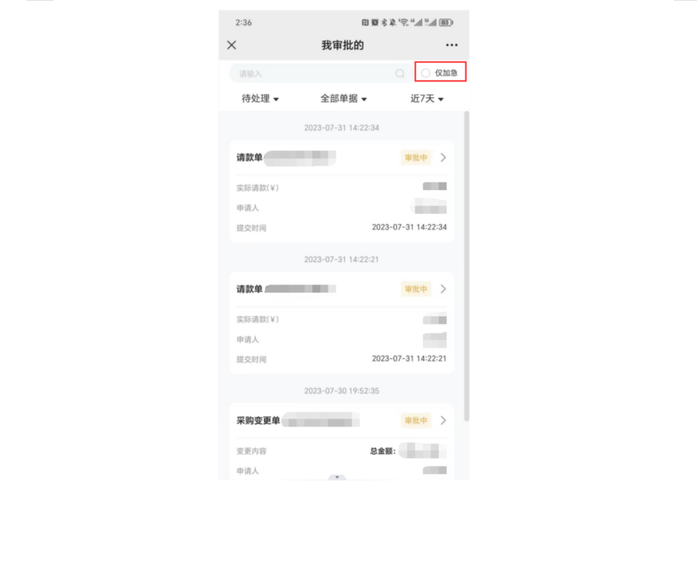 点击查看详细信息,操作审核,支持查看加急审核单据。目前支持审核单据有:采购单、采购变更单、请款单、采购计划。