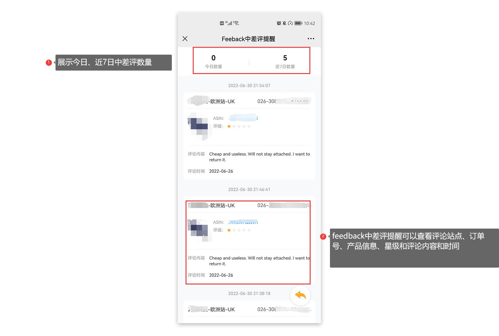 统计今日和近7日feedback消息条数,优先展示最新收到的Feedback差评信息。