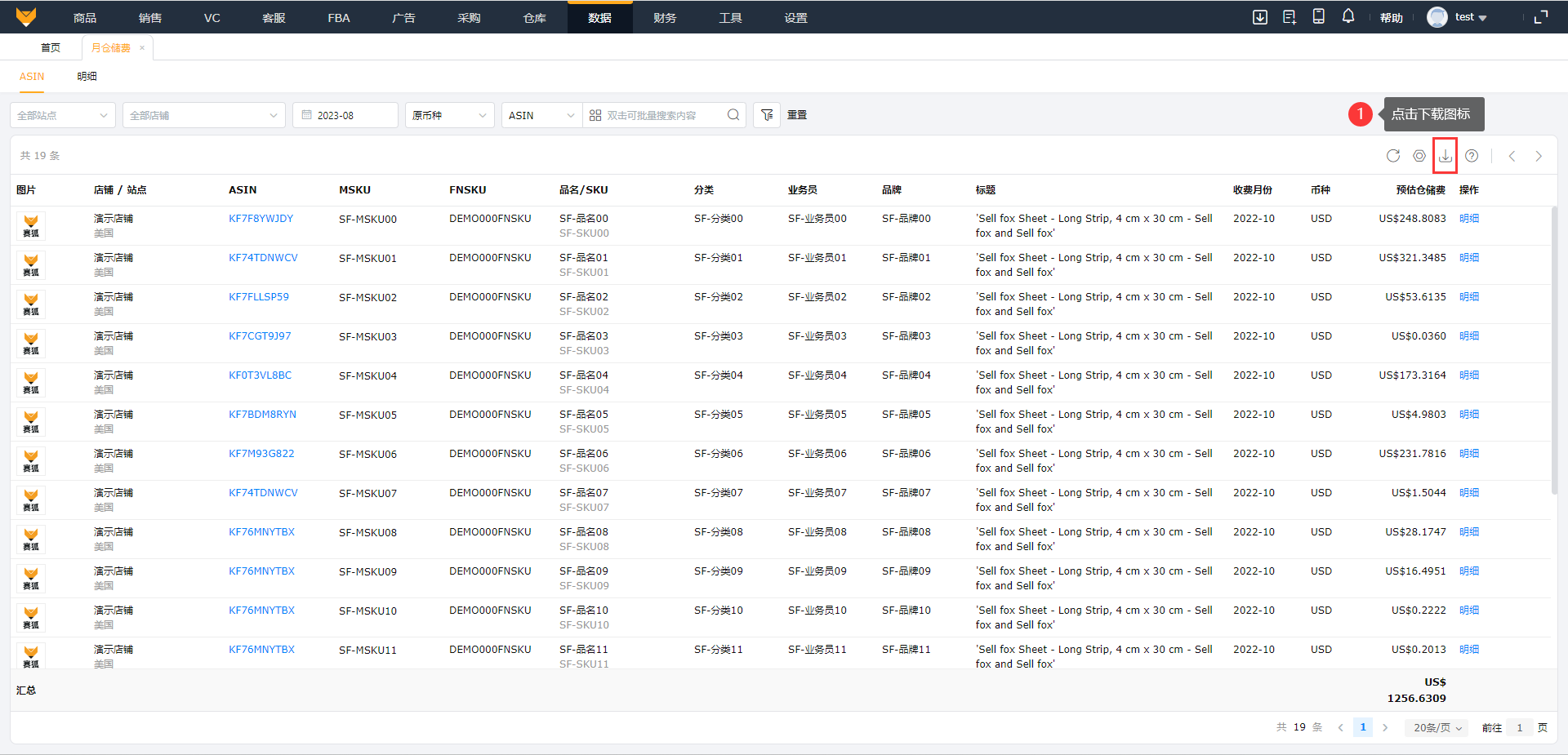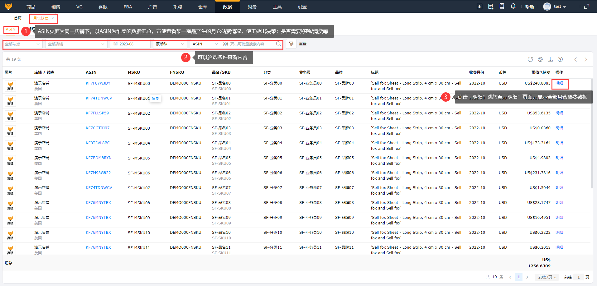 ASIN页面为同一店铺下以ASIN为维度的数据汇总,方便查看某一商品产生的月仓储费情况,便于做出决策-是否需要移除/清货等。点击“明细”跳转“明细”页面可查看全部月仓储费数据。