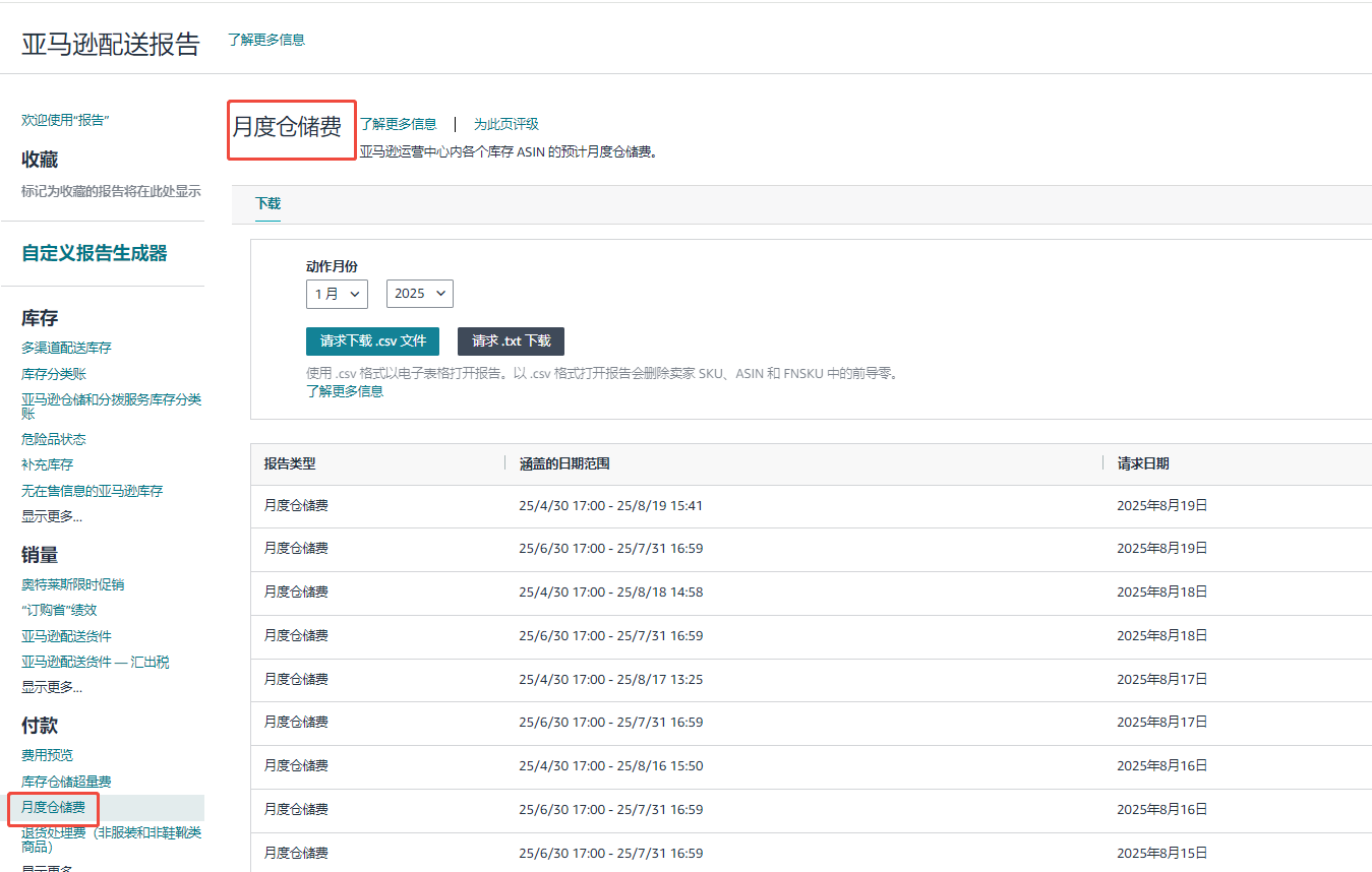 亚马逊报表位置:【报告-配送-月仓储费报告】