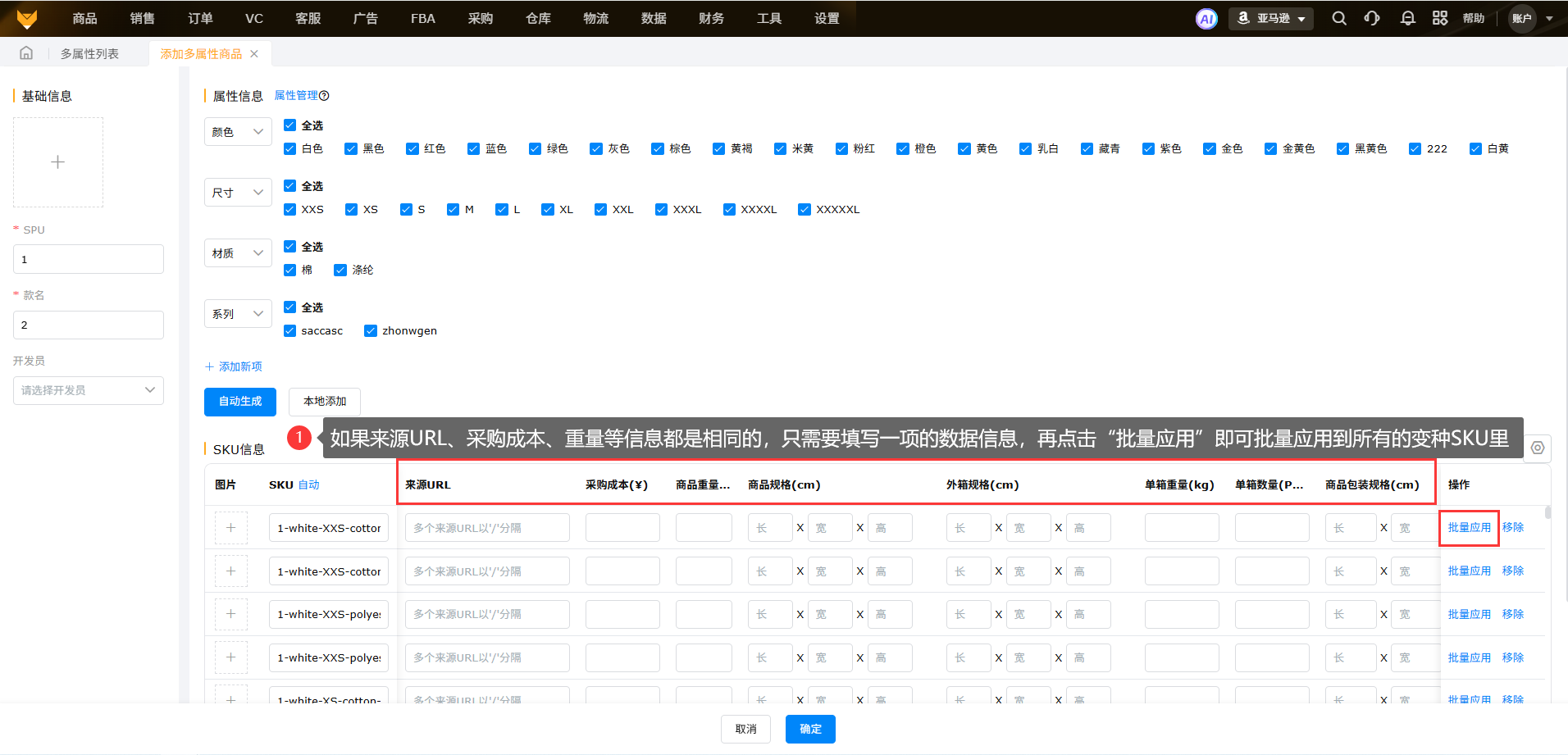 (4)如果名称、来源URL、采购成本、重量等信息都是相同的,只需在其中一列填入数据信息,再点击“批量应用”即可批量添加到所有的变种SKU里。
