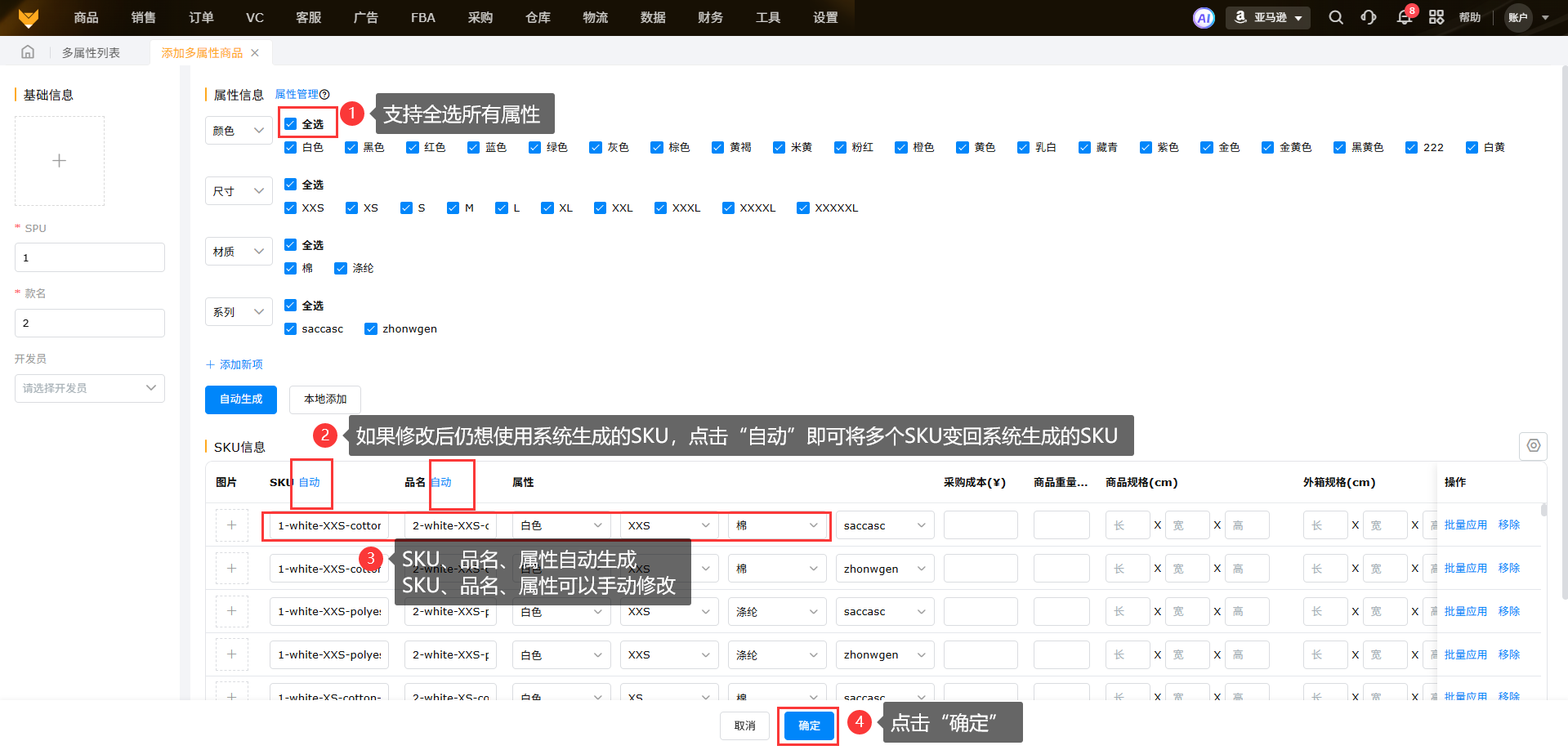 (3)选择属性、点击【自动生成】生成SKU变种,SKU支持自定义修改,如SKU修改后想使用系统生成的SKU,点击“自动”即可全部SKU变回系统自动生成的SKU。