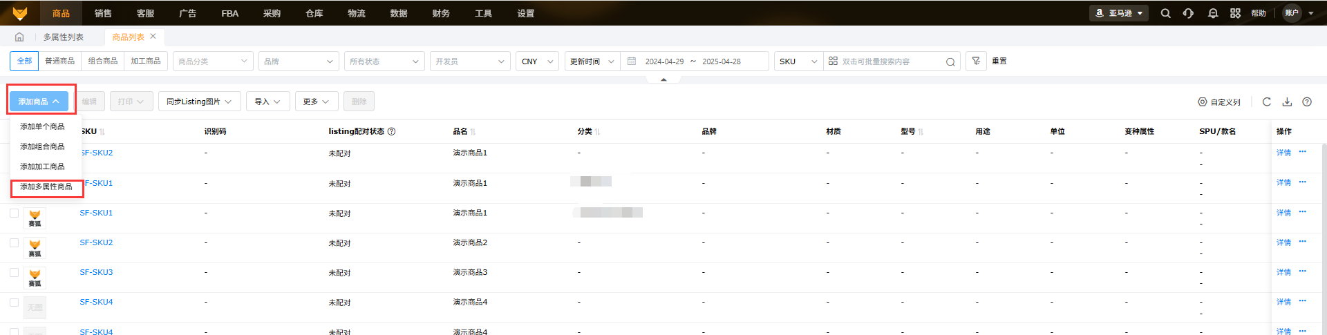 (1)商品列表中,点击【添加商品】,选择【添加多属性商品】。