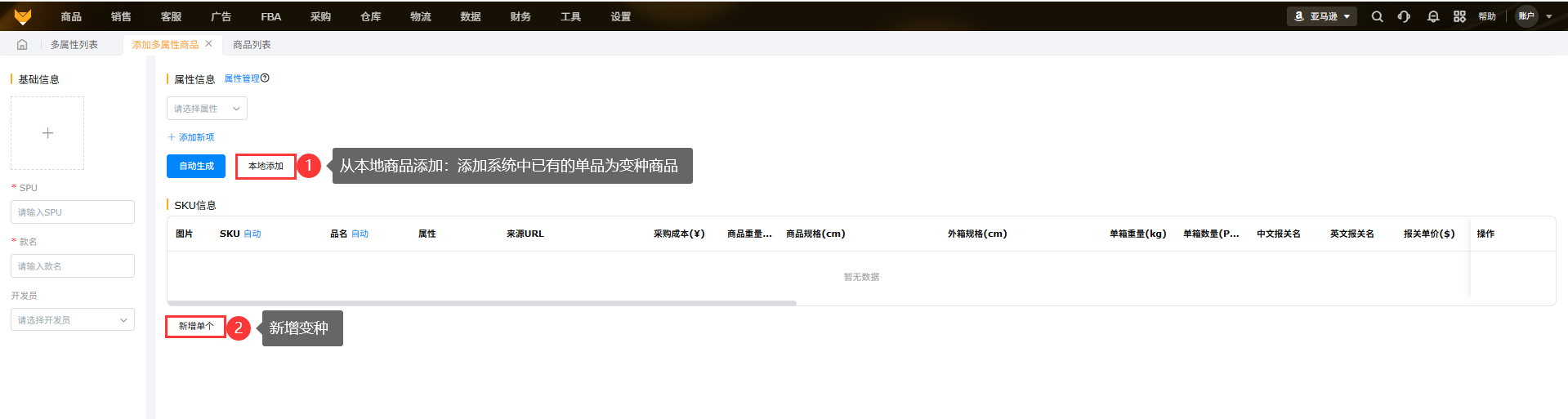 (3)支持添加新变种,点击“新增单个”或者【本地添加】即:添加【商品列表】中的单个商品为变种商品。