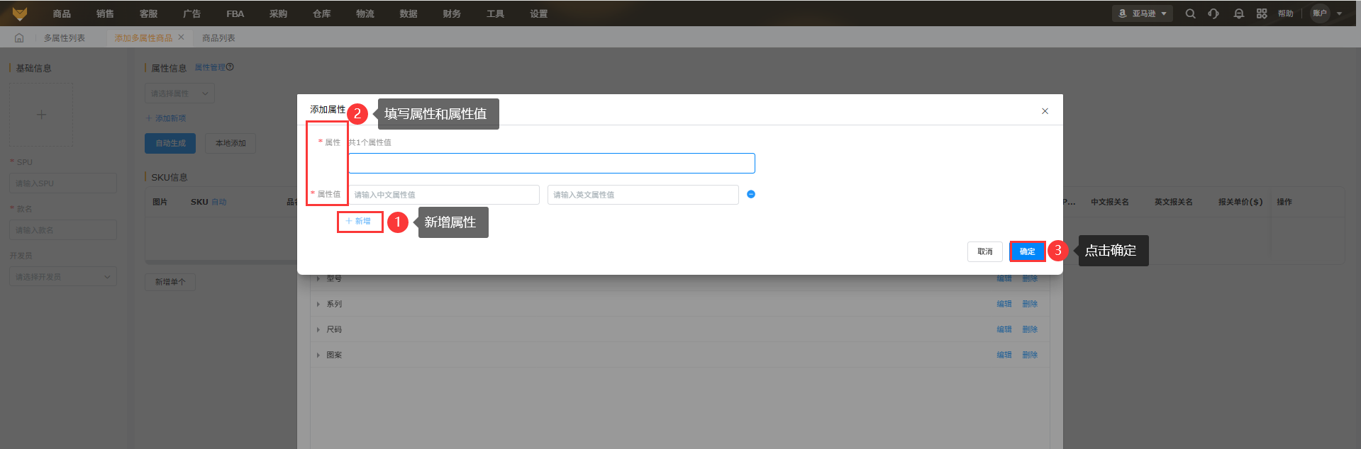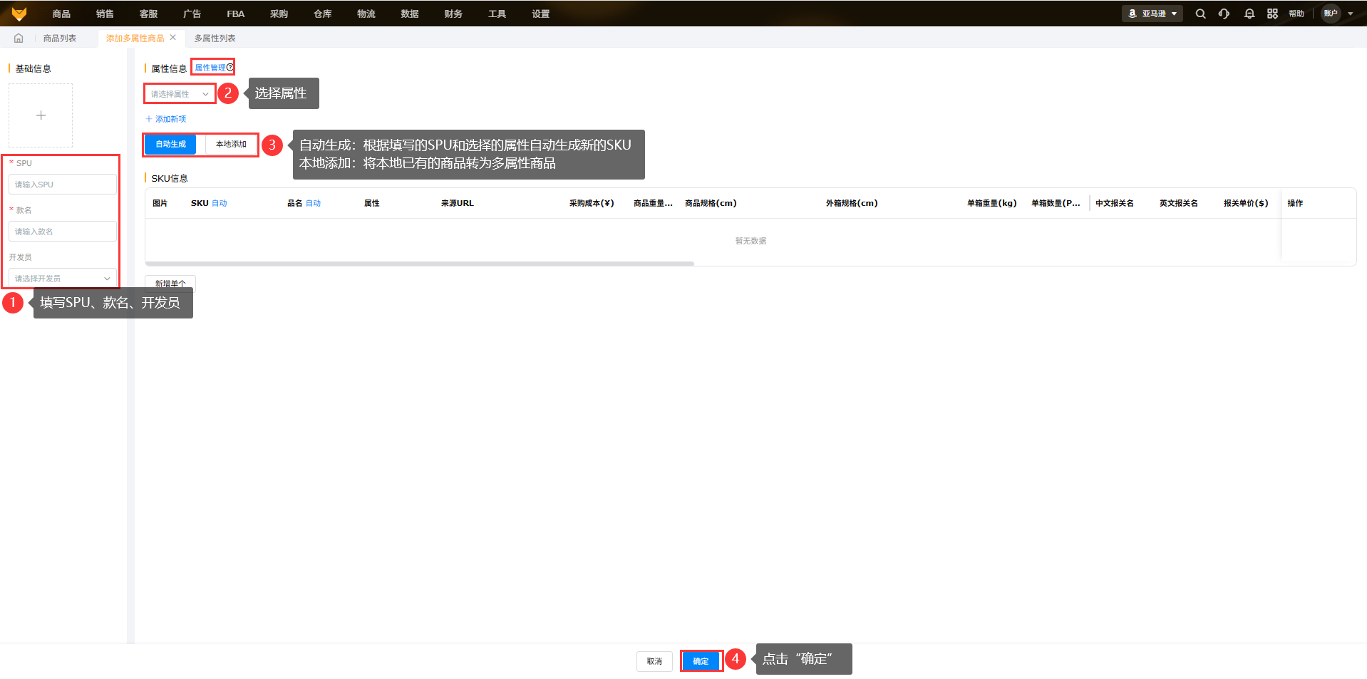 (2)多属性商品中点击【添加多属性商品】,填写spu、款名、开发员,选择属性。