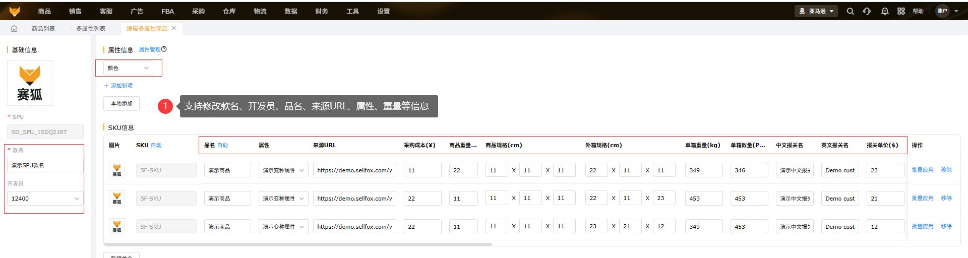 (2)编辑界面支持修改款名,修改变种SKU的名称、来源URL、采购成本、重量等信息。