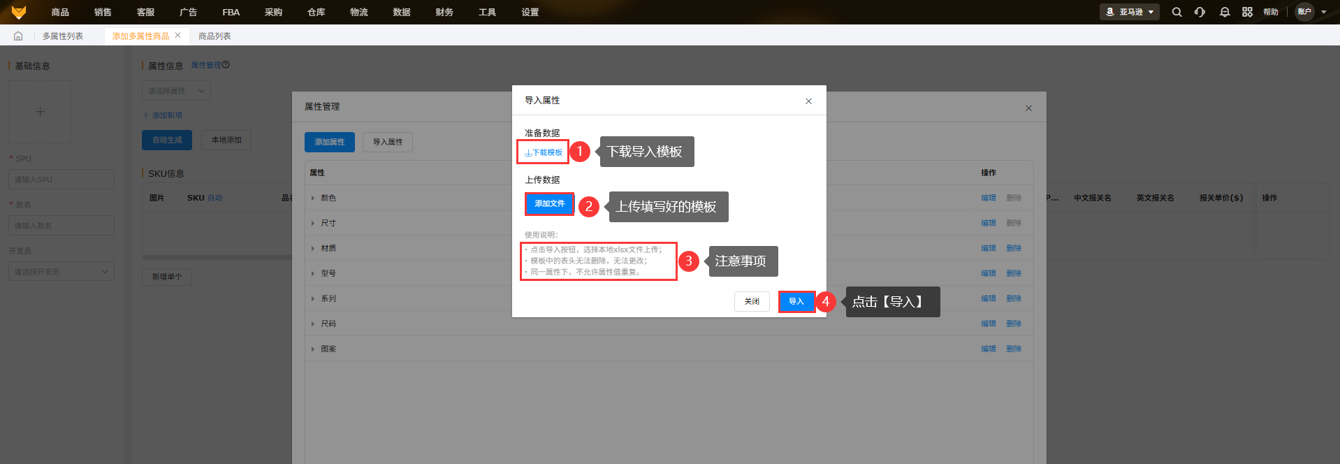A2:如果通过表格往SPU里导入添加新的SKU,需要通过多属性列表里的更新多属性文档导入