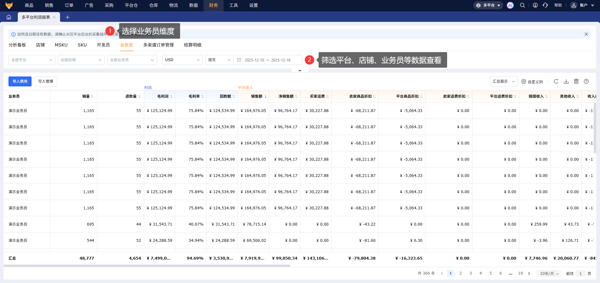 查看所有平台、店铺对应业务员的收支明细和毛利润数据。