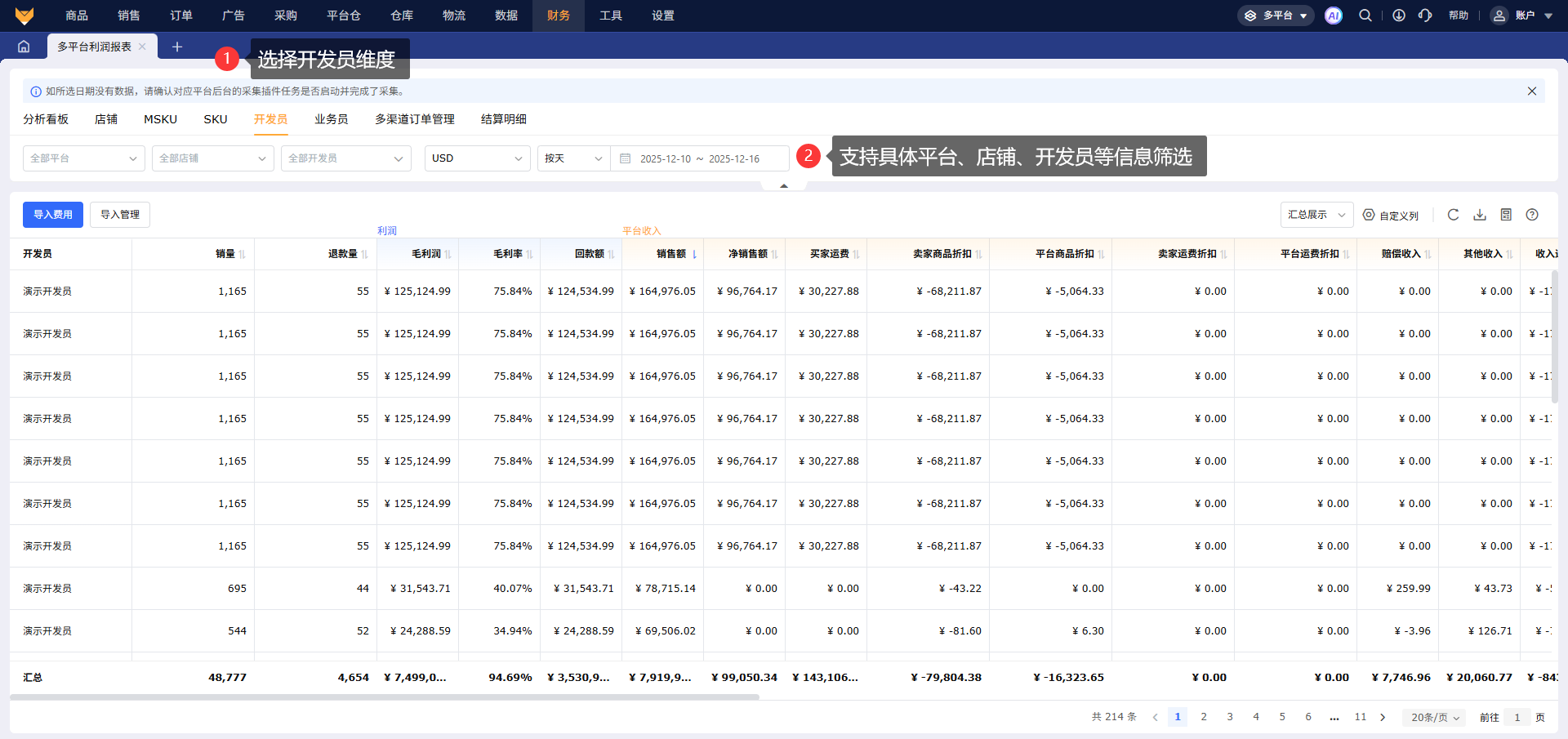 查看所有平台、店铺对应开发员的收支明细和毛利润数据。