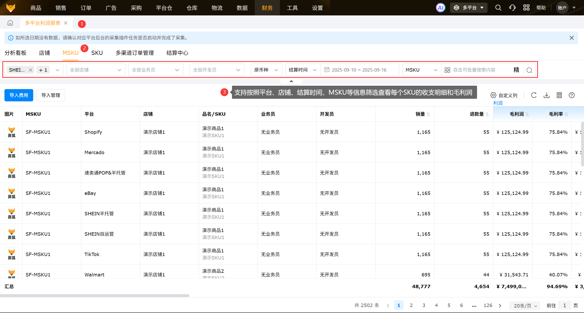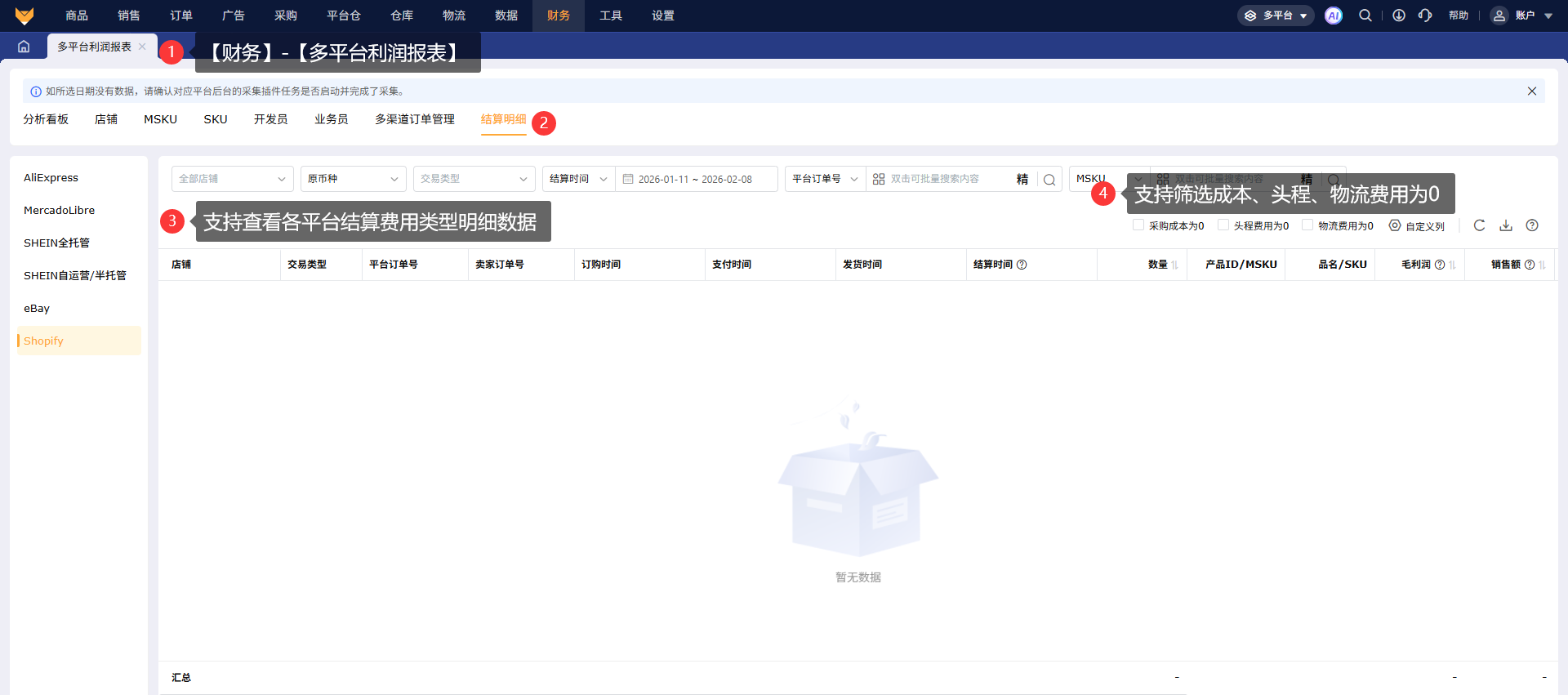 查看所有店铺每个MSKU的收支明细和毛利润。