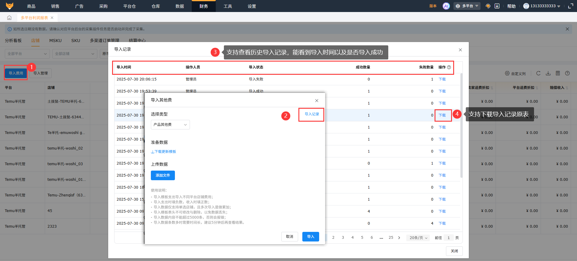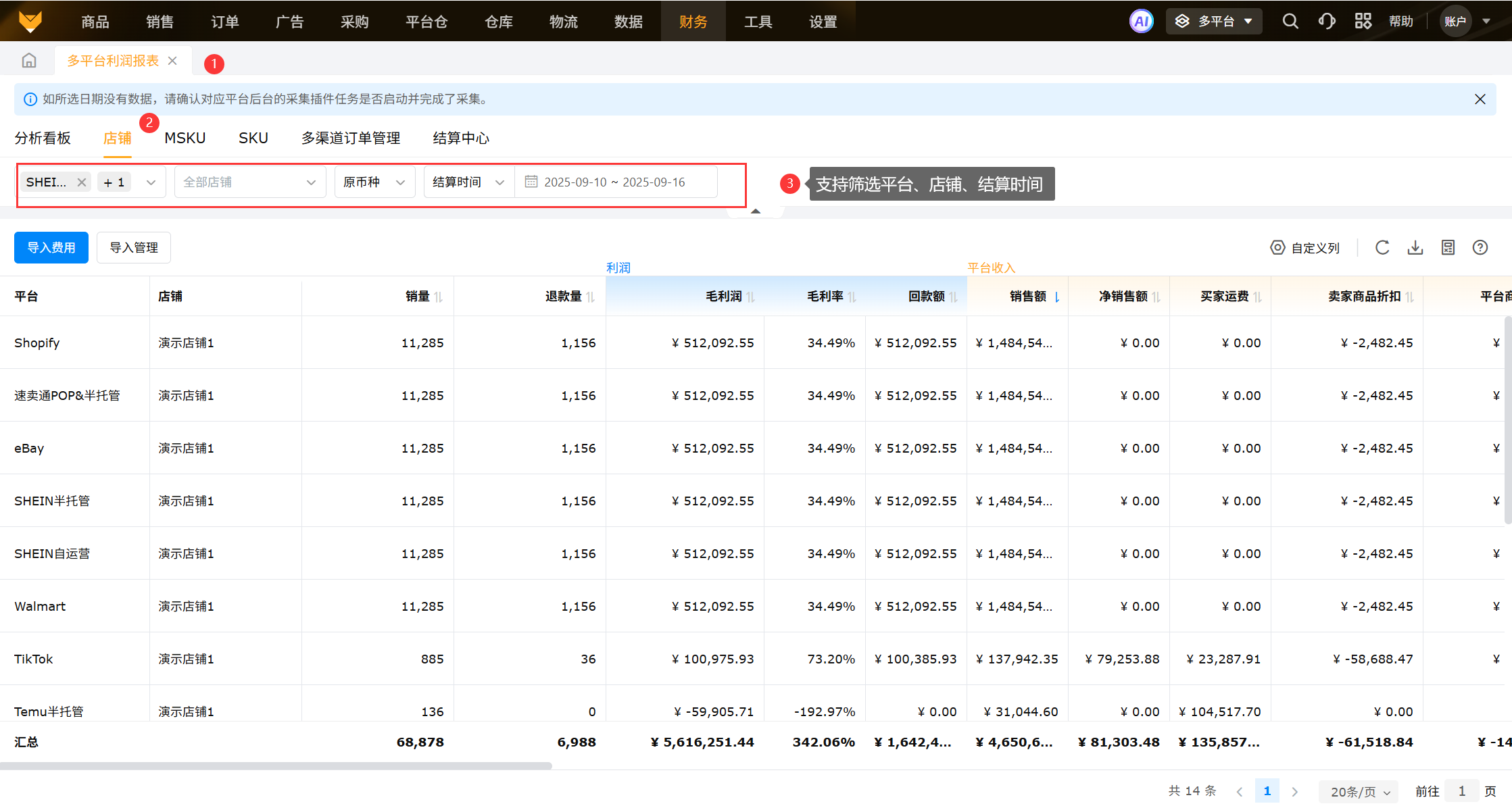显示所有平台店铺对应的利润数据,支持筛选任意平台、店铺以及时间查看。