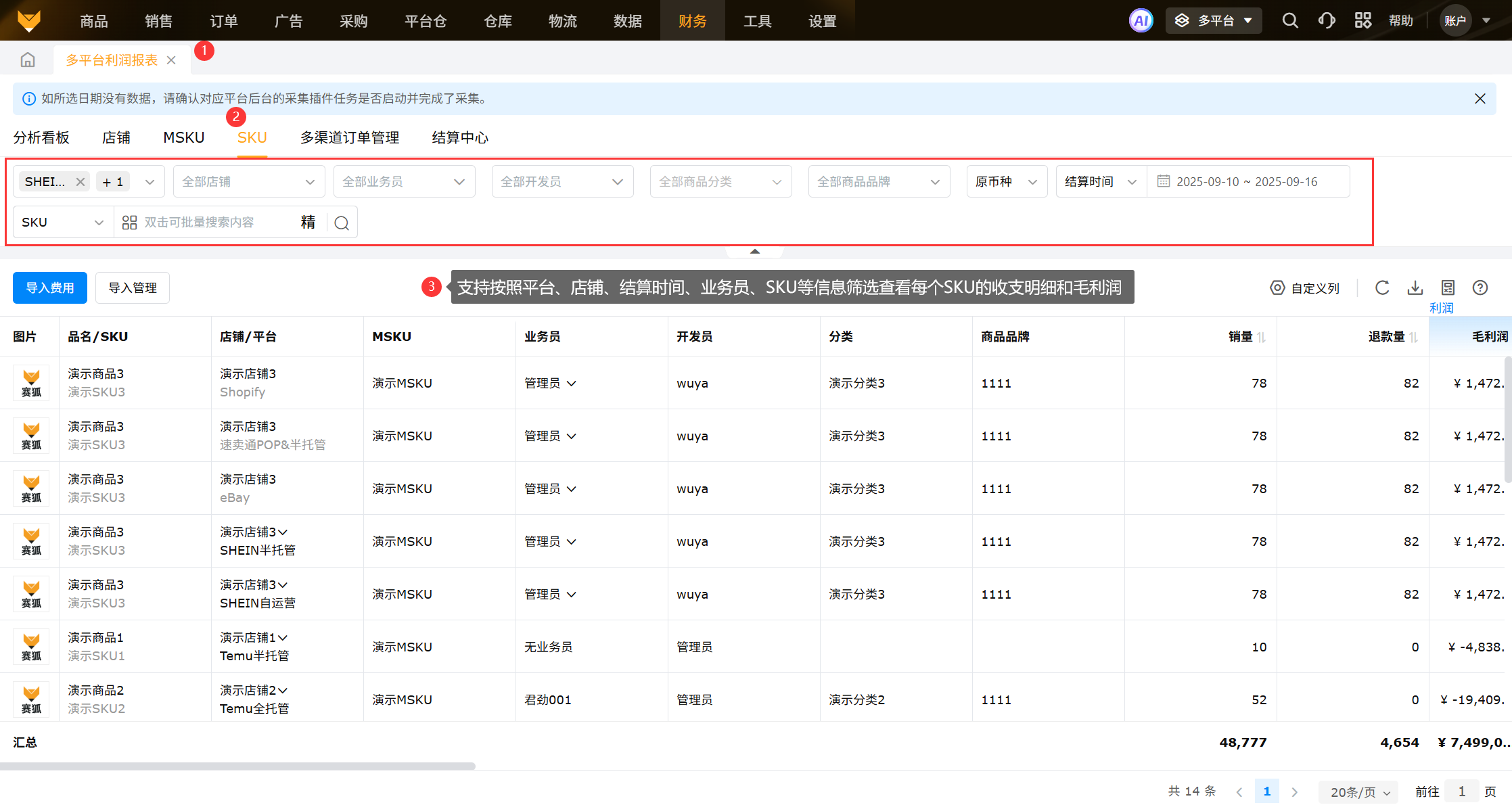 查看所有店铺对应的SKU的收支明细和毛利润。