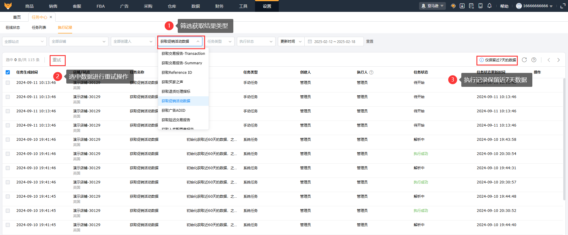支持筛选站点、店铺、创建人、获取结果、任务类型、执行状态和更新时间查看数据。