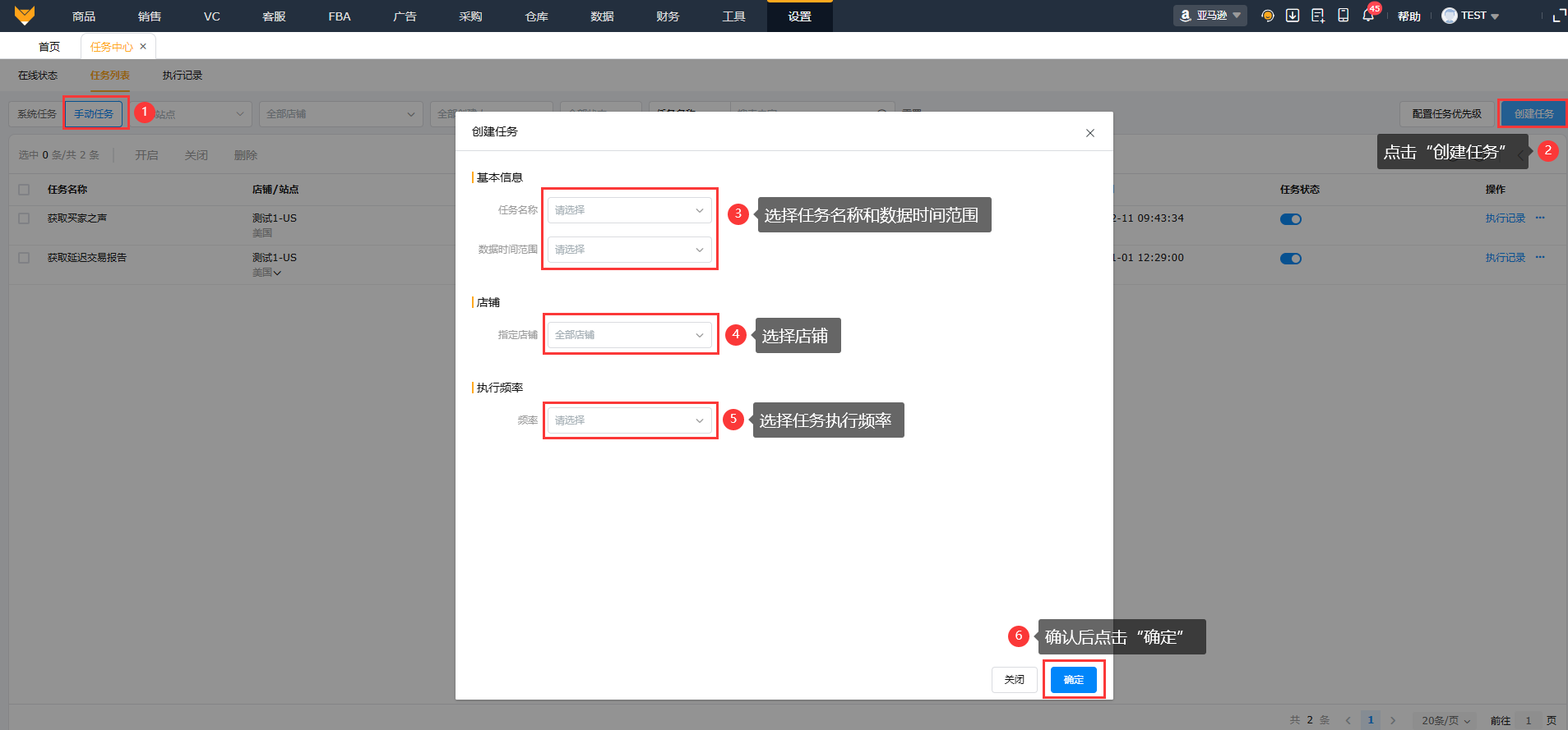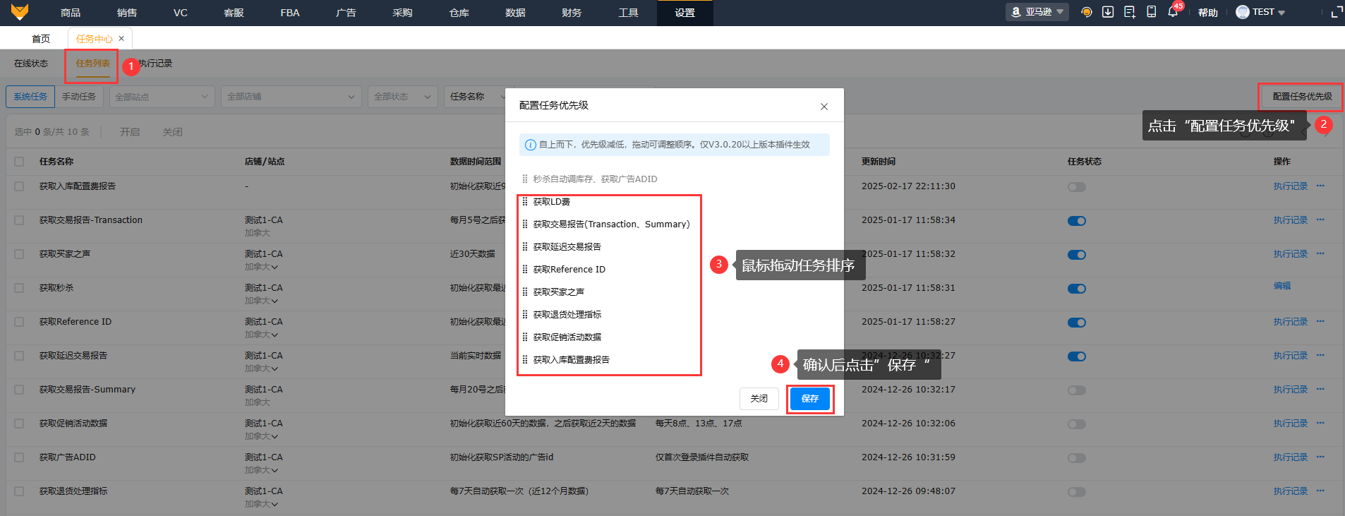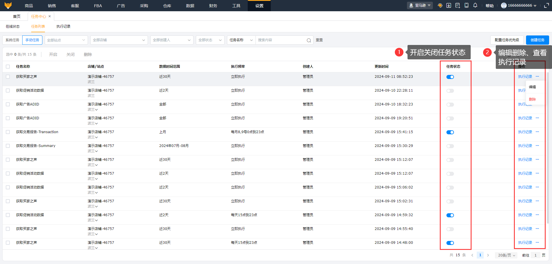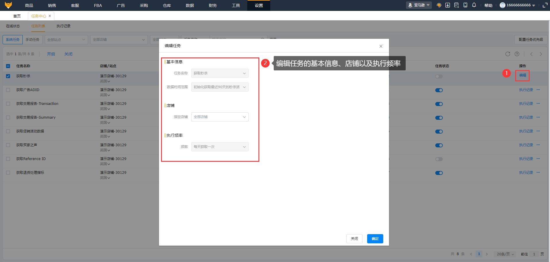 1、系统任务:支持查看店铺站点、数据时间范围、执行频率、开启关闭任务状态、编辑、执行记录以及配置任务优先级。