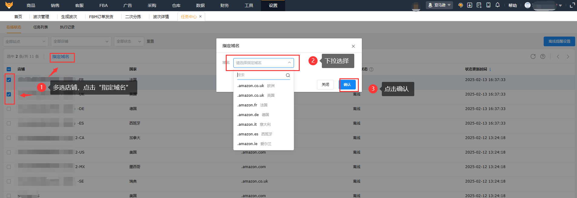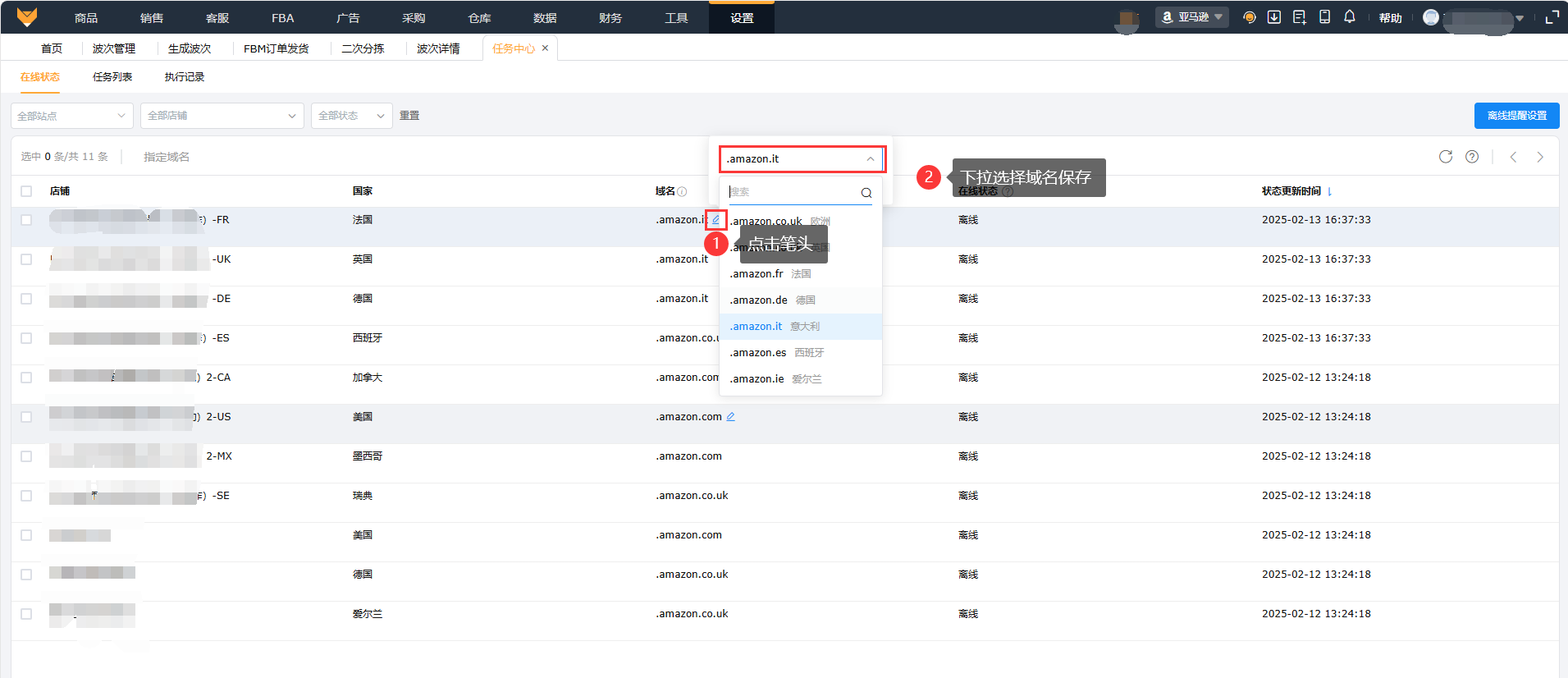 店铺站点可以指定对应站点域名,比如欧洲只做了德国站,指定域名".amazon.de",设置域名是为了方便插件获取数据,避免后台站点登录不上,获取数据失败。