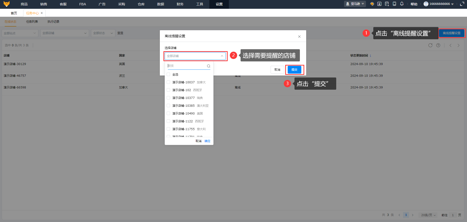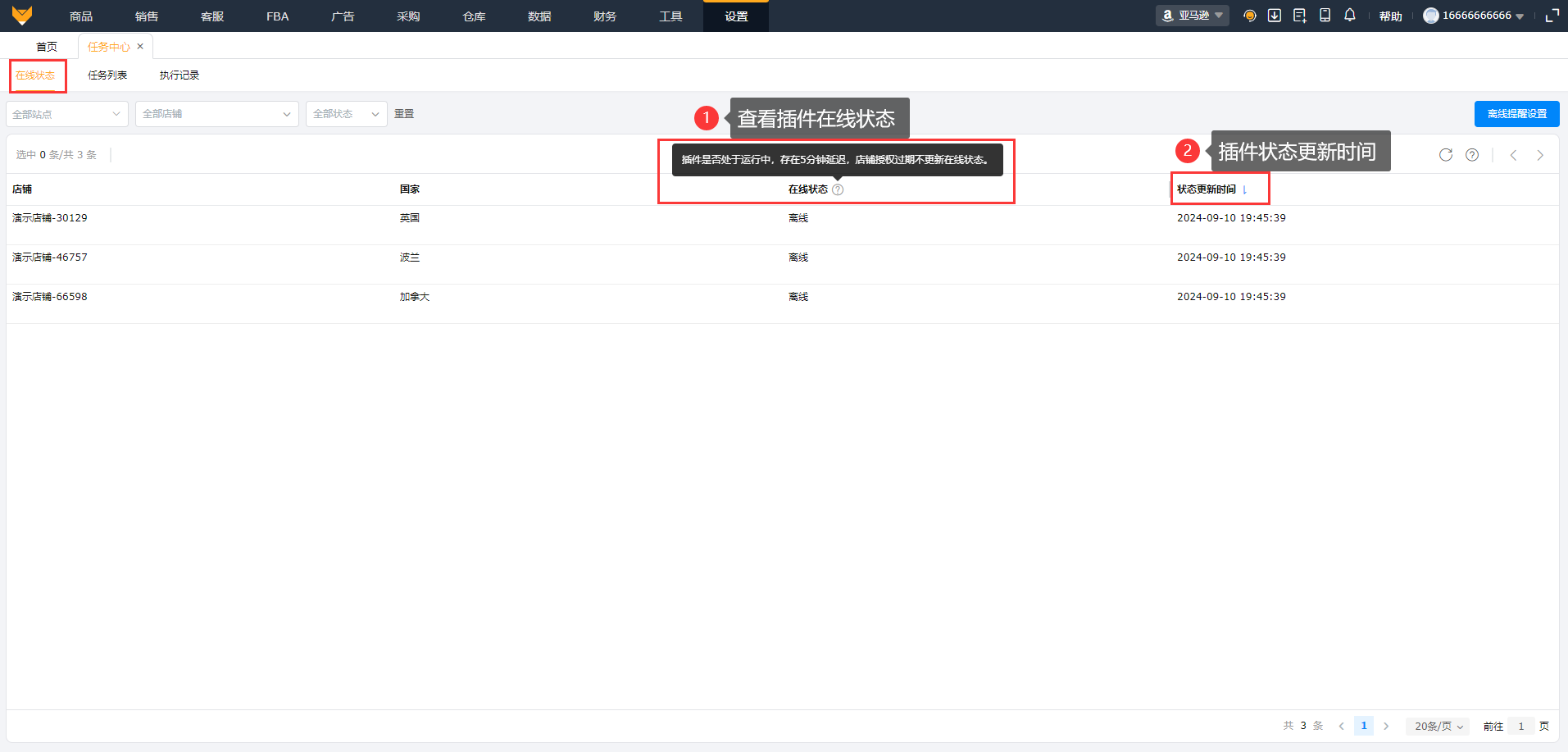 2、支持设置离线提醒,当插件与亚马逊后台没有同时在线时,可提醒用户。