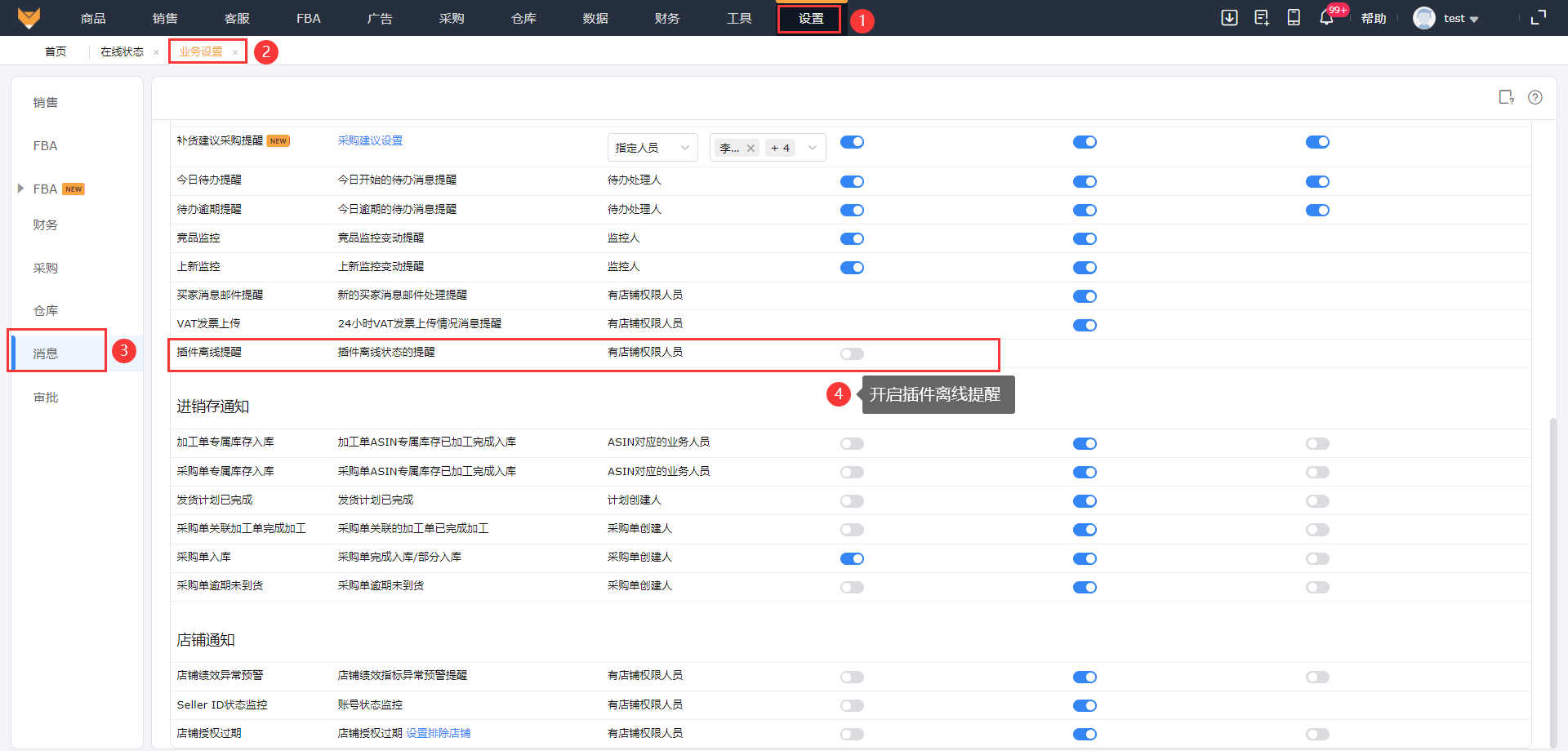 ②设置->业务设置->消息->运营通知中开启消息提醒