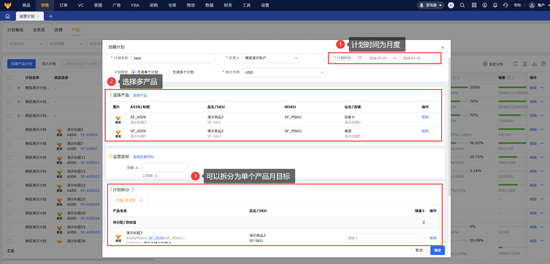 4.2 产品运营计划拆分:当选择多产品计划、计划周期为月时,支持设置单个产品月目标。