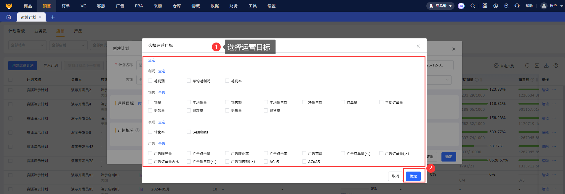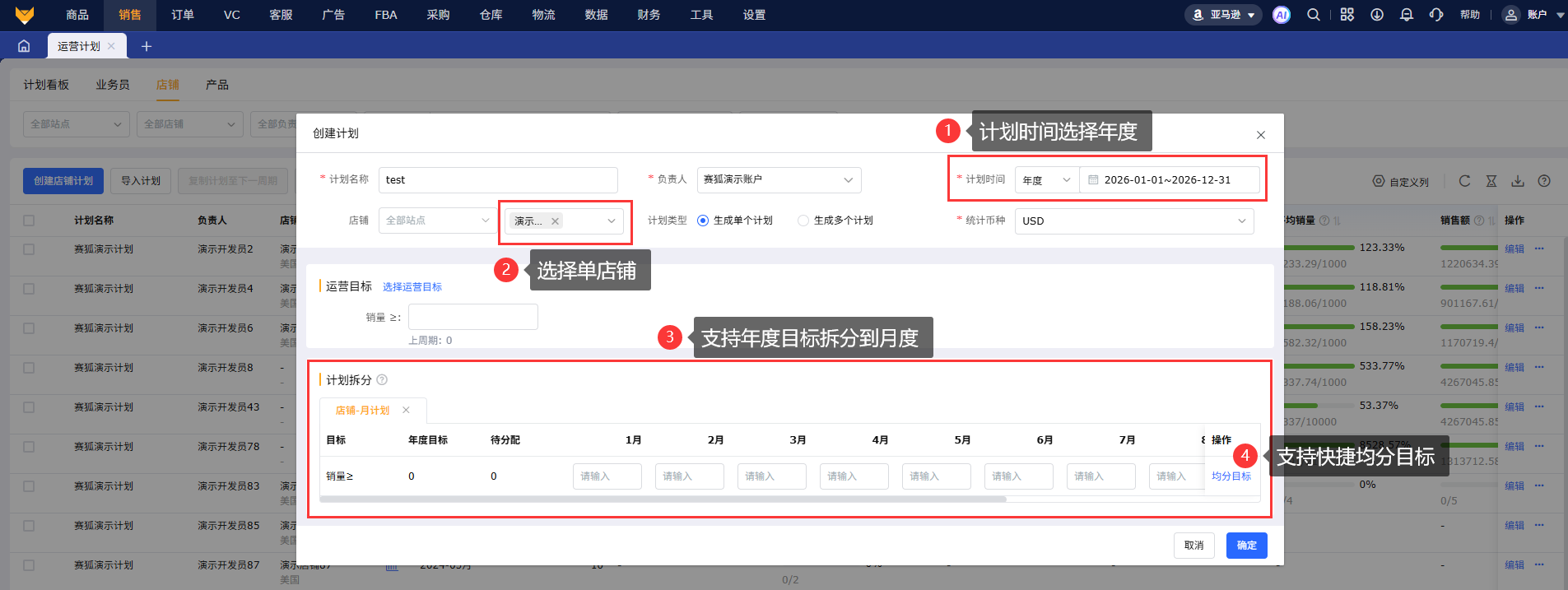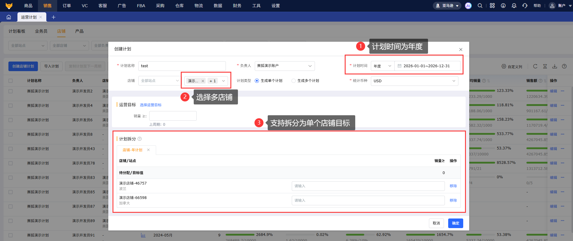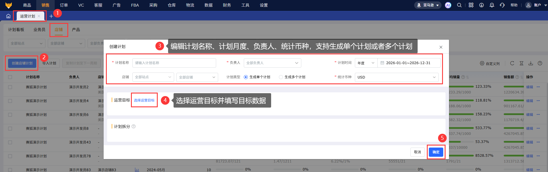 3.1 点击“创建店铺计划”,编辑计划名称,选择计划时间、负责人、统计币种;支持生成单个计划或多个计划,选择站点、店铺;选择运营目标并填写目标数据。