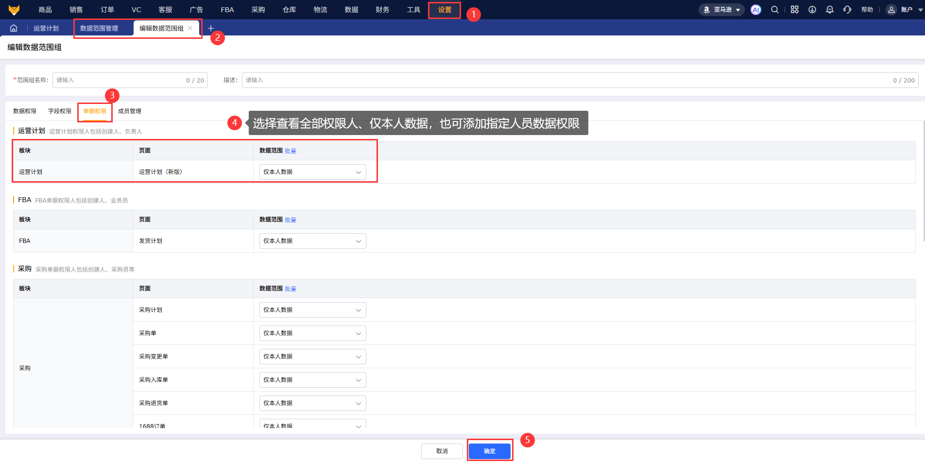 1.2.设置数据范围权限:在【设置】-【数据范围管理】中,【单据权限】维度可设置运营计划(新版)单据的数据范围为全部权限人、仅本人数据,也可添加指定人员数据权限。