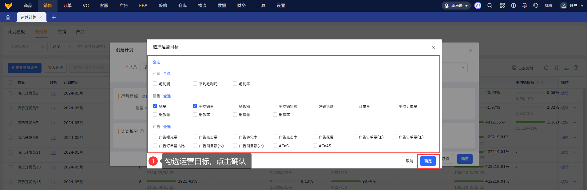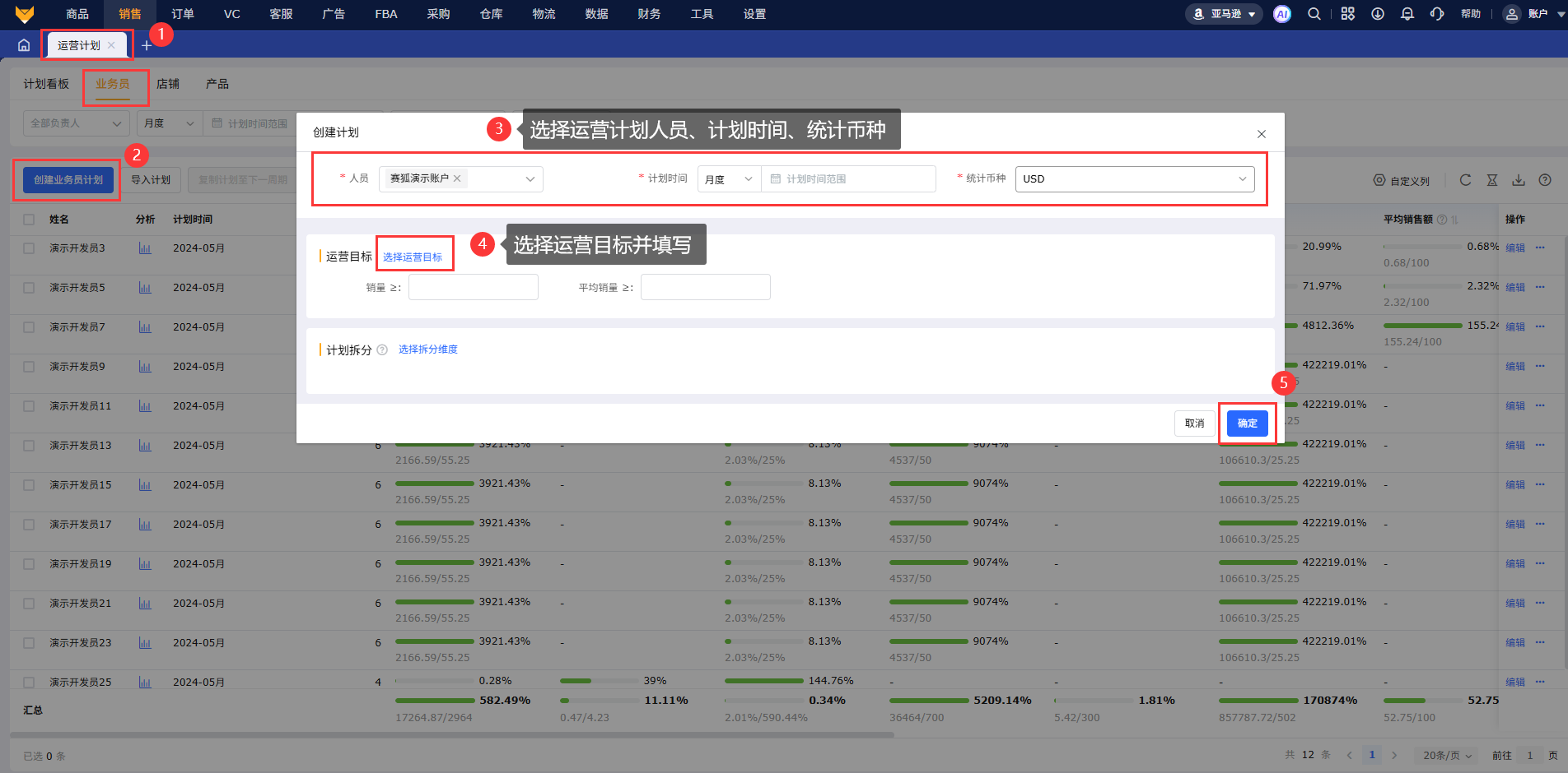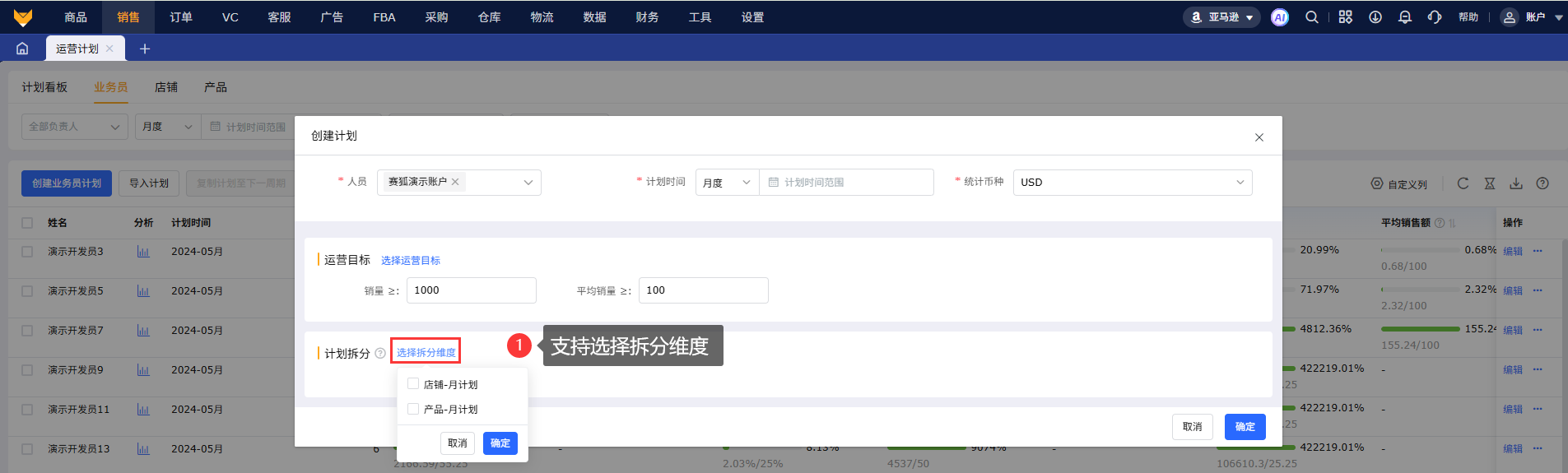 2.1 点击“创建业务员计划”,支持多选负责人员,按周、月度、季度设置计划时间,支持设置统计币种,选择运营目标:包含利润、销量相关10+个指标。