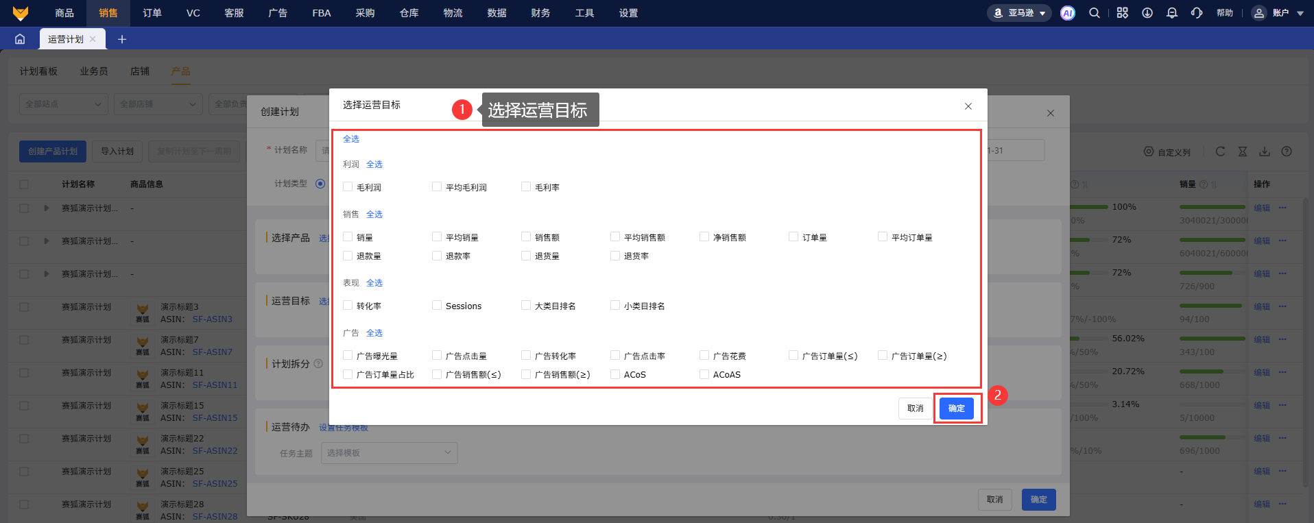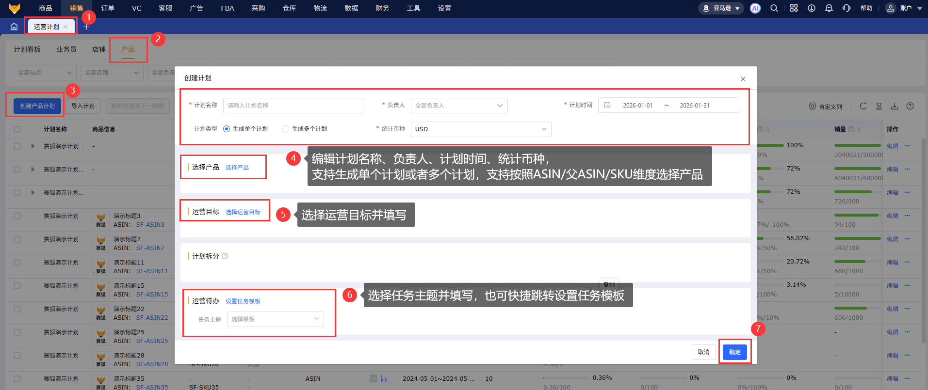 4.1 点击“创建产品计划”,编辑计划名称,选择计划时间、负责人、统计币种;支持生成单个计划或多个计划,支持按照父asin、asin、sku三个维度选择产品,一个计划最多添加1000个产品;选择运营目标并填写目标数据;选择任务主题并填写任务,快捷跳转设置任务模板页面。