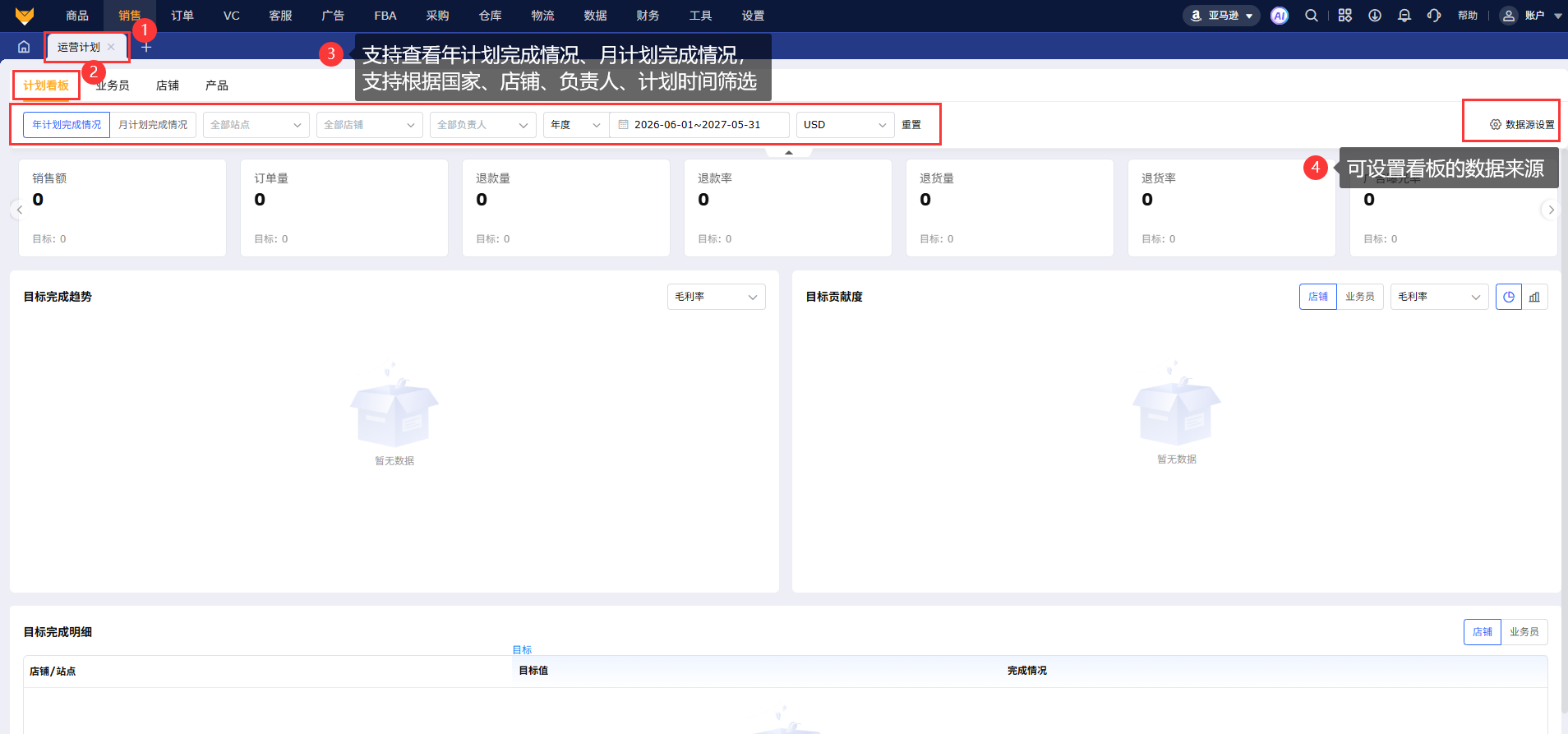 业务员维度运营目标数据除退款量、退货量、退货率、退款率取自【产品分析】,其余取自【销售利润】-业务员维度。
