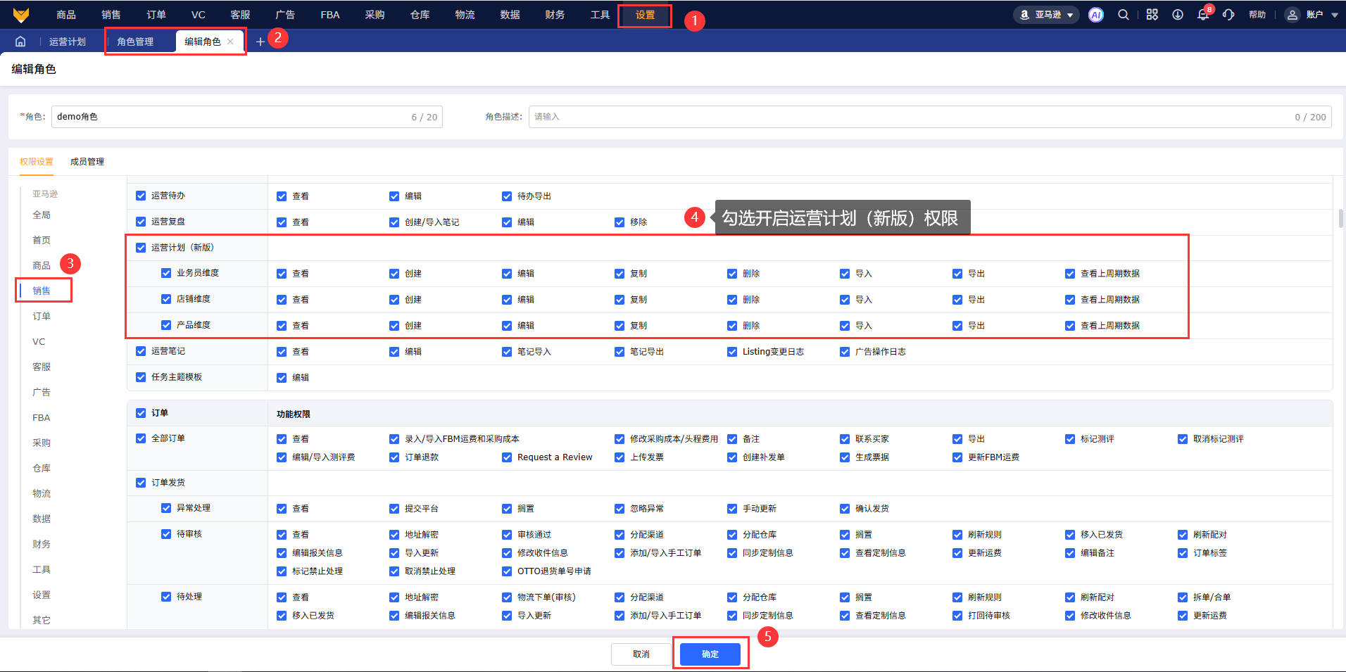 1.1 开启功能权限:在【设置】-【角色管理】中勾选开启销售-运营计划(新版)的权限。
