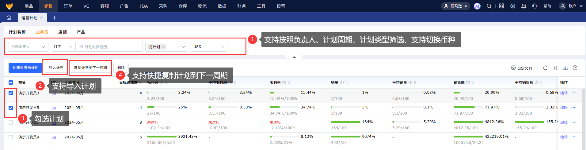 2.3 业务员维度支持按照负责人、计划时间、计划类型筛选查看计划,支持切换币种,支持导入计划、快捷复制计划到下一周期。