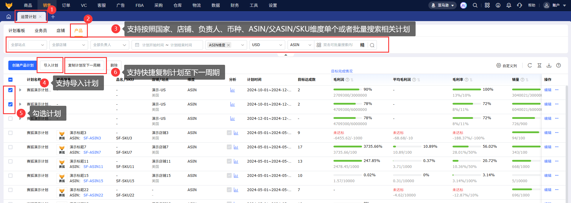 4.3 产品维度支持按照国家、计划、负责人、计划开始时间-计划结束时间、计划维度筛选查看计划,支持切换币种,支持按照asin、父asin、sku三个维度单个或批量搜索相关计划,支持导入计划、快捷复制计划到下一周期。