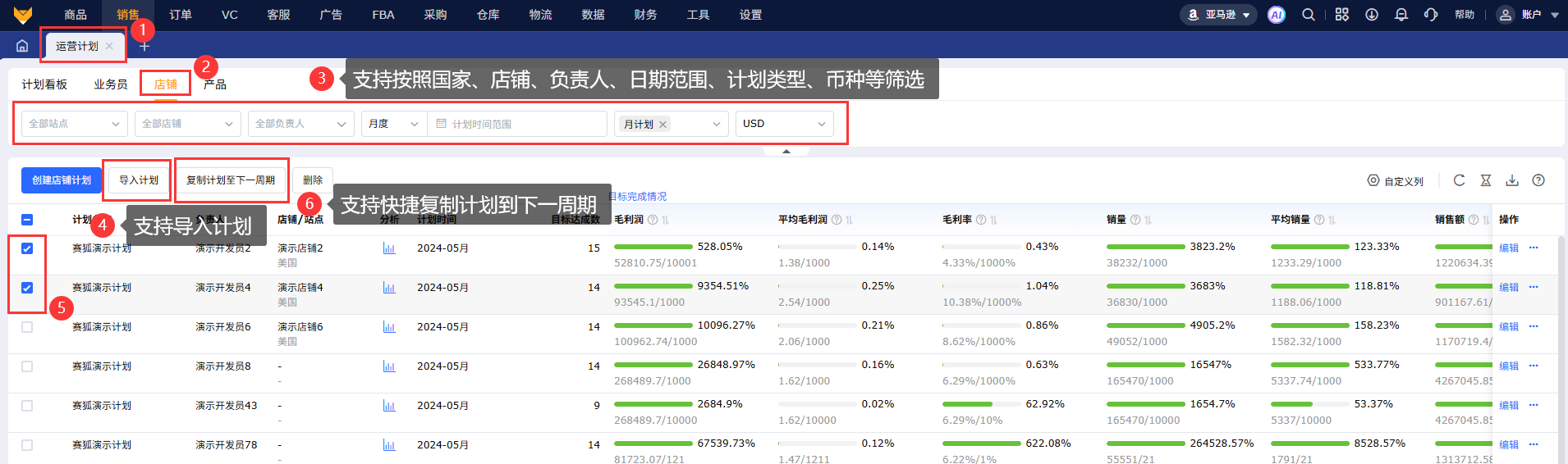 3.3 店铺维度支持按照国家、计划、负责人、计划时间、计划类型筛选查看计划,支持切换币种,支持导入计划、快捷复制计划到下一周期。