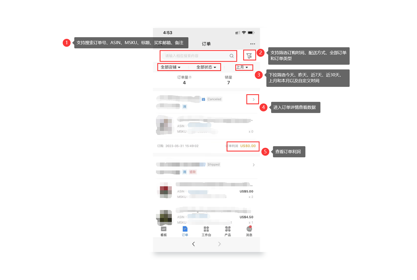 1.1 查看【订单-全部订单-亚马逊】的订单利润和详细数据,支持按照店铺、国家、订单状态和时间来筛选。