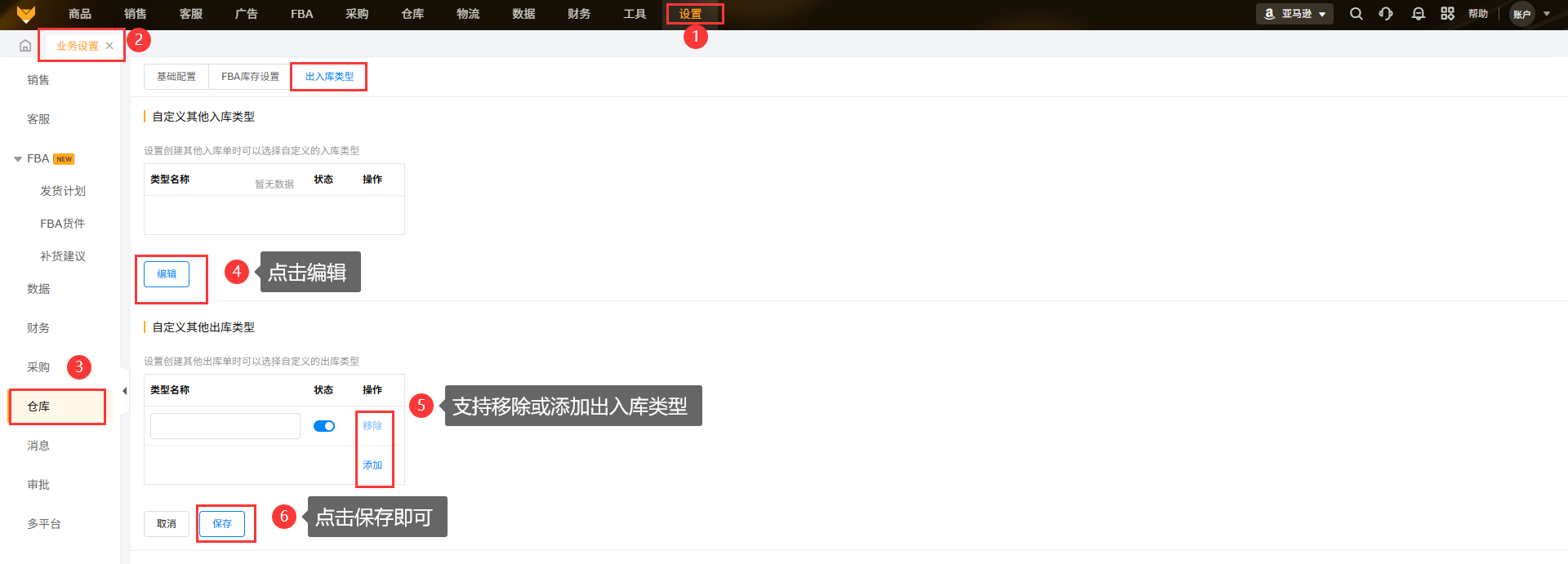 在【设置】-【业务设置】-仓库-出入库类型设置页面,点击编辑可以添加出库类型,点击保存即可。