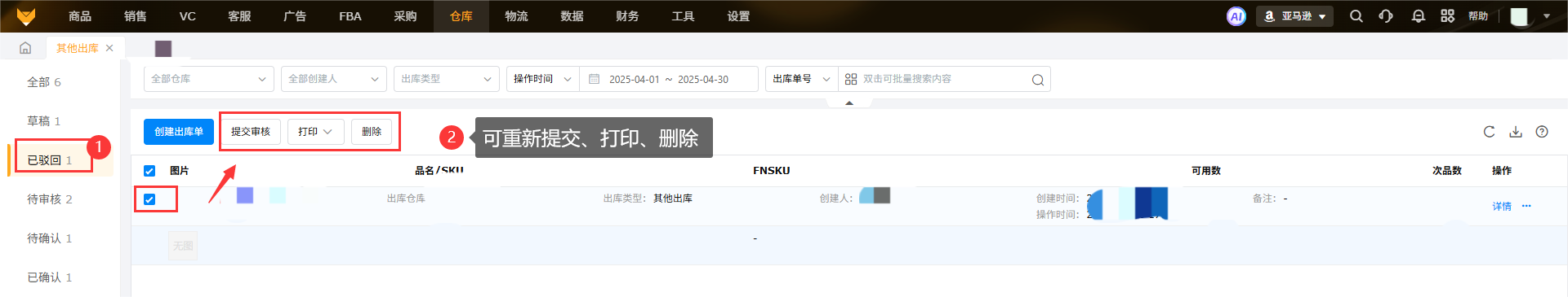 (3)审核驳回,进入驳回页面,可操作重新提交审核、打印、删除